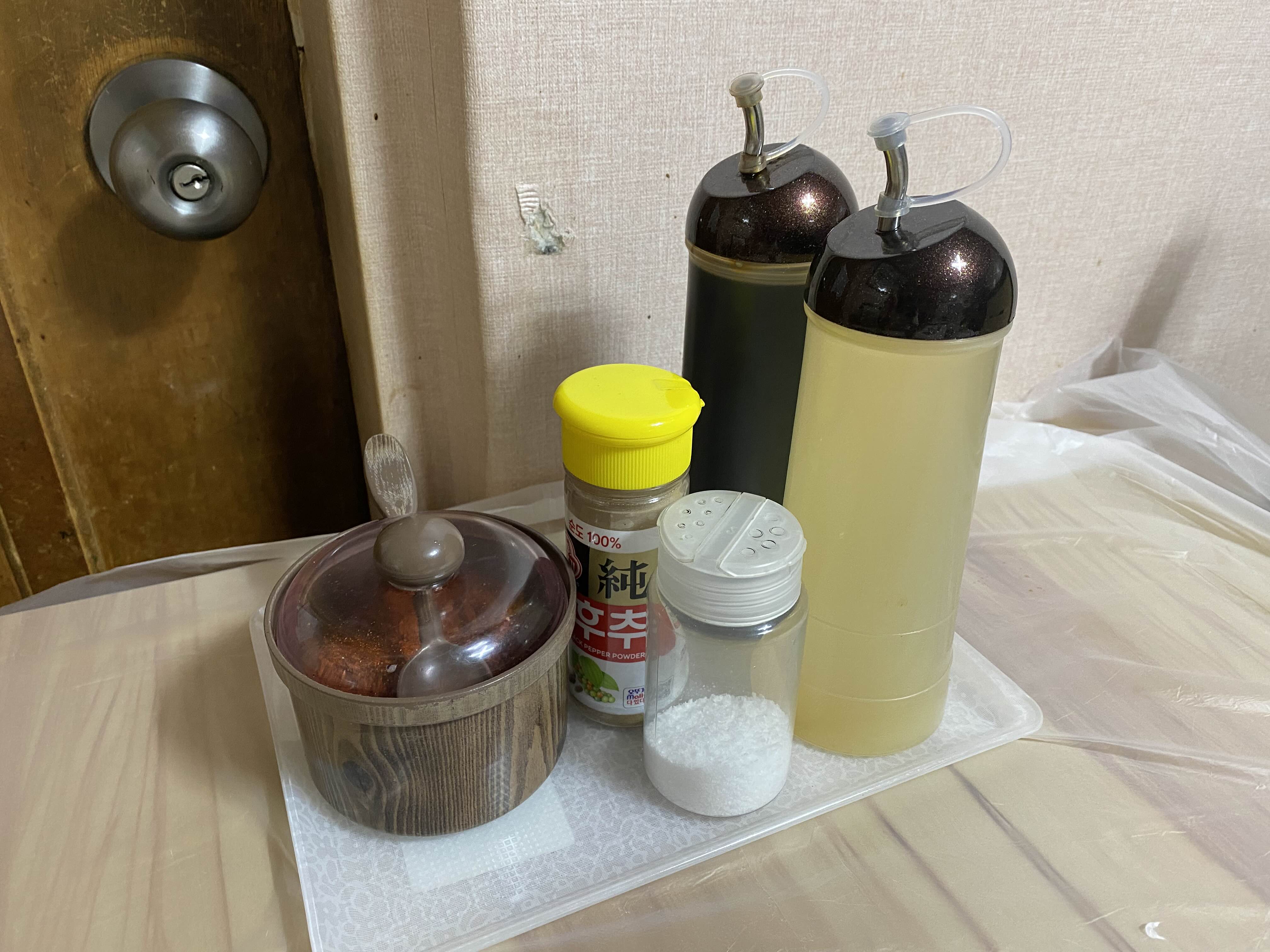 테이블에는 간장, 식초, 고춧가루와