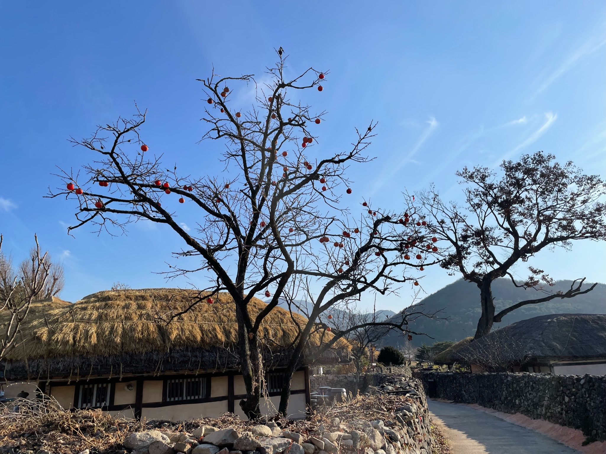 초가집과 돌담과 감나무의 풍경이