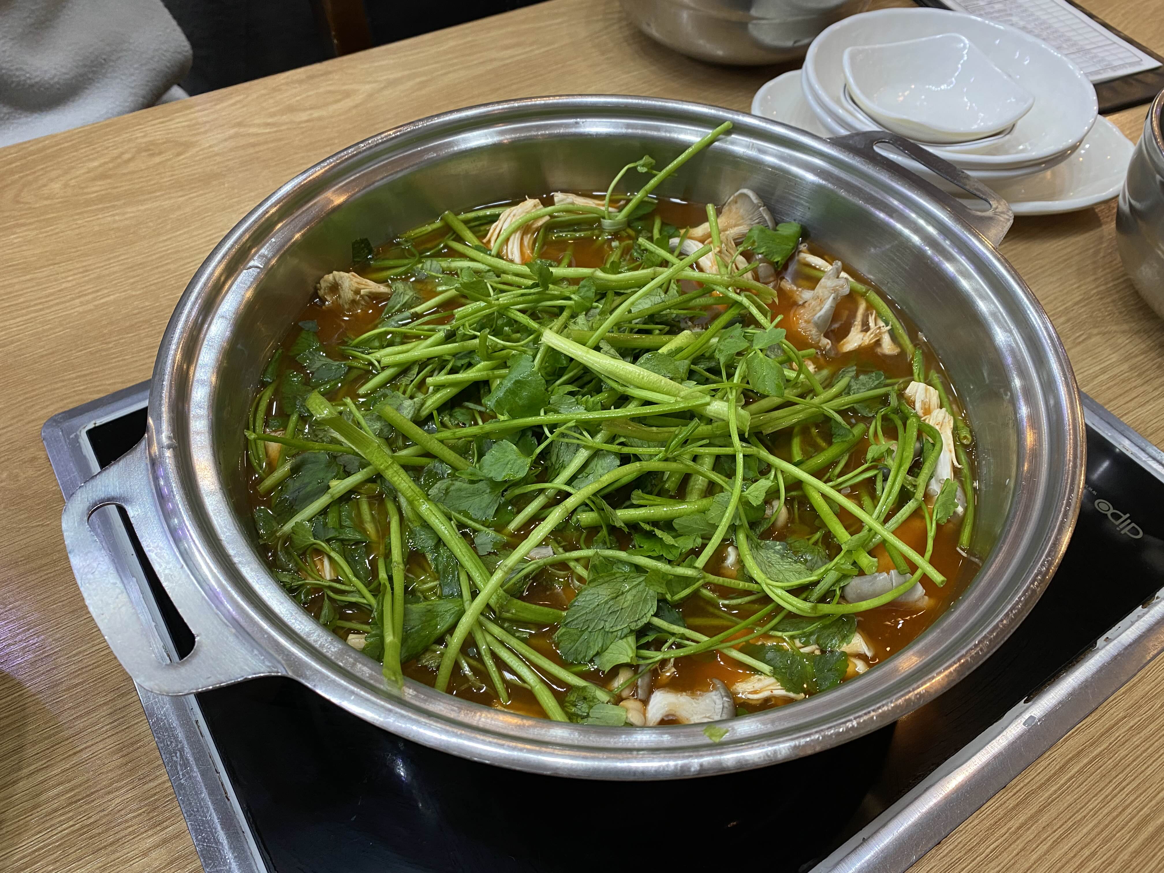 버섯과 미나리가 들어간 국물과