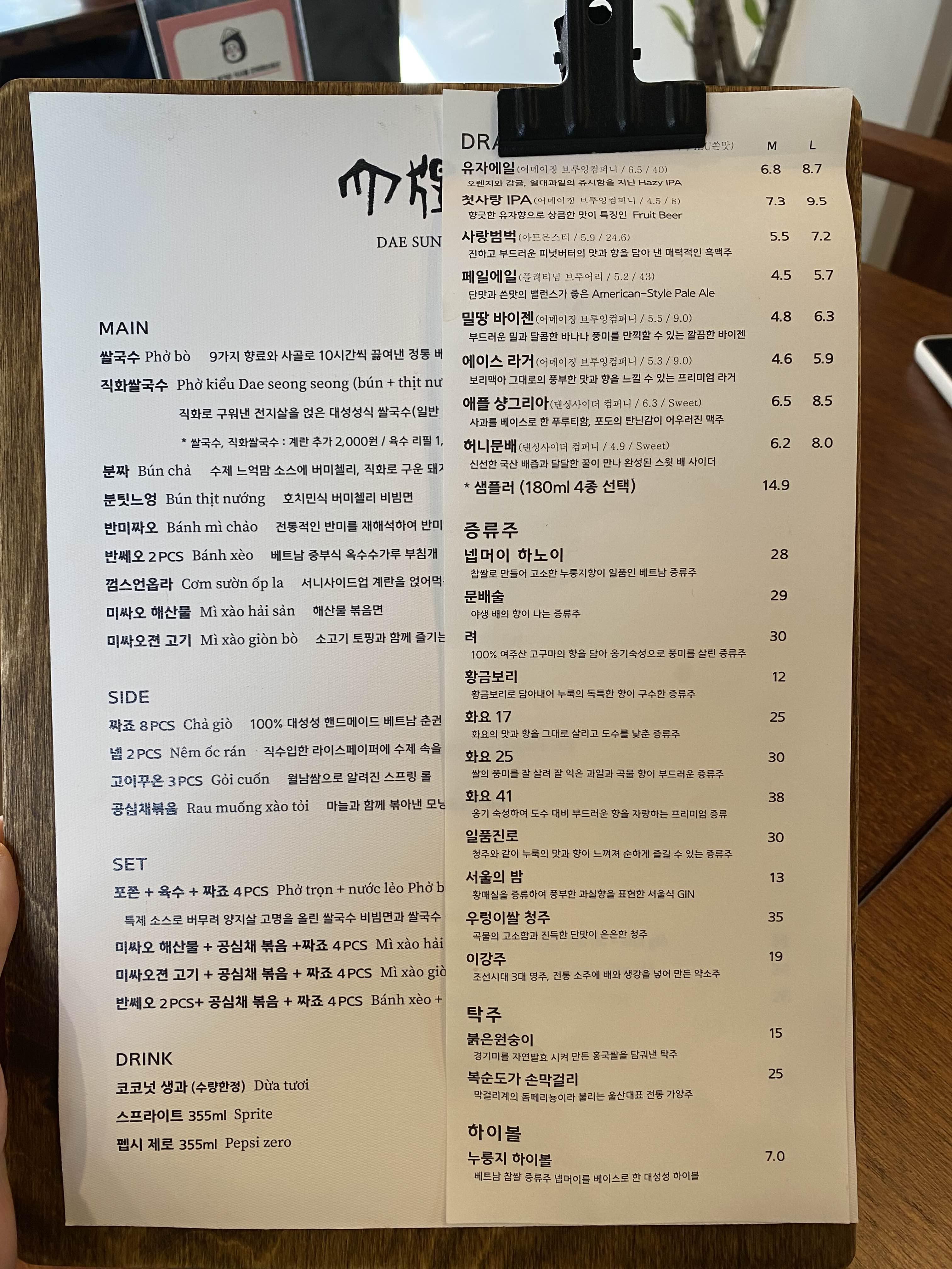 대성성의 메뉴와 주류 메뉴판.