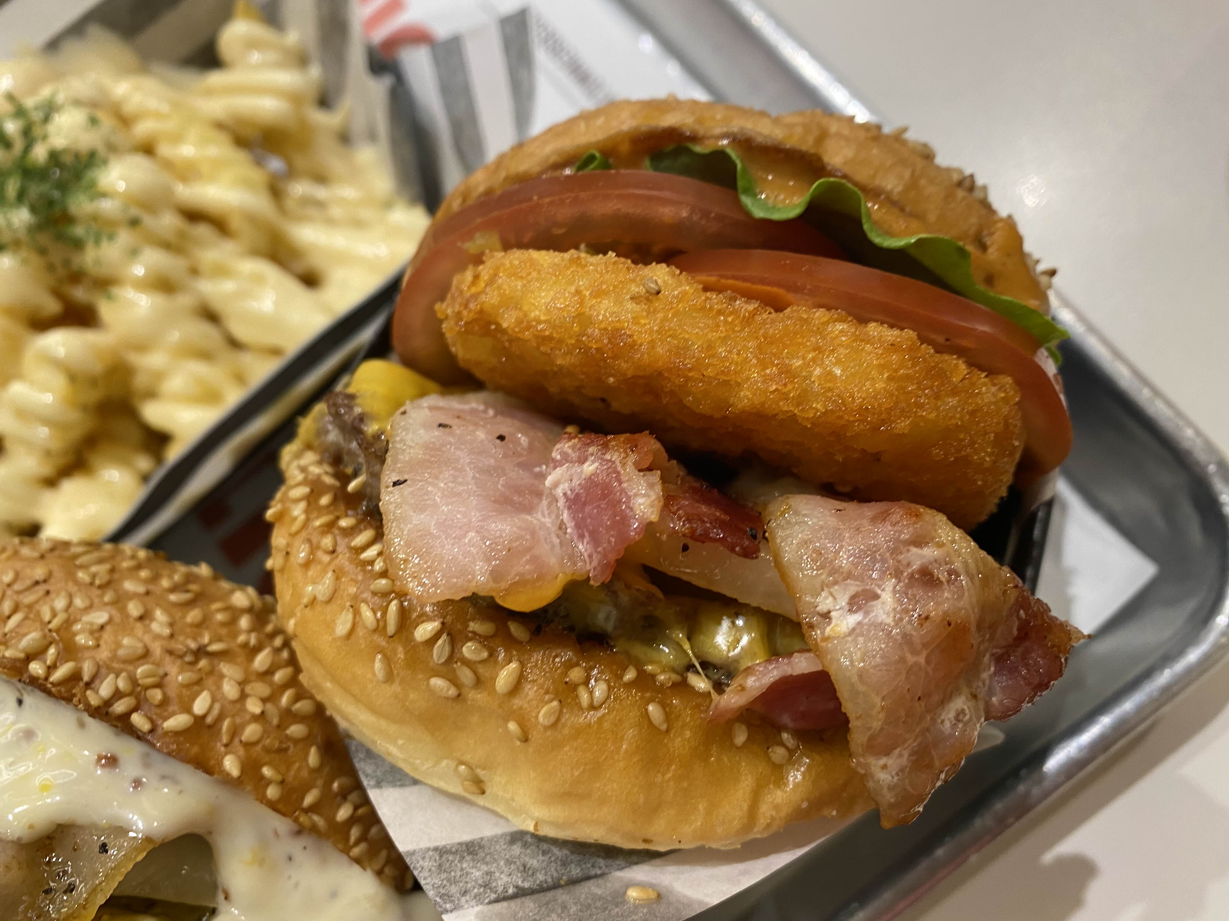 소고기 패티에 베이컨, 아메리칸 치즈, 구운 양파에
