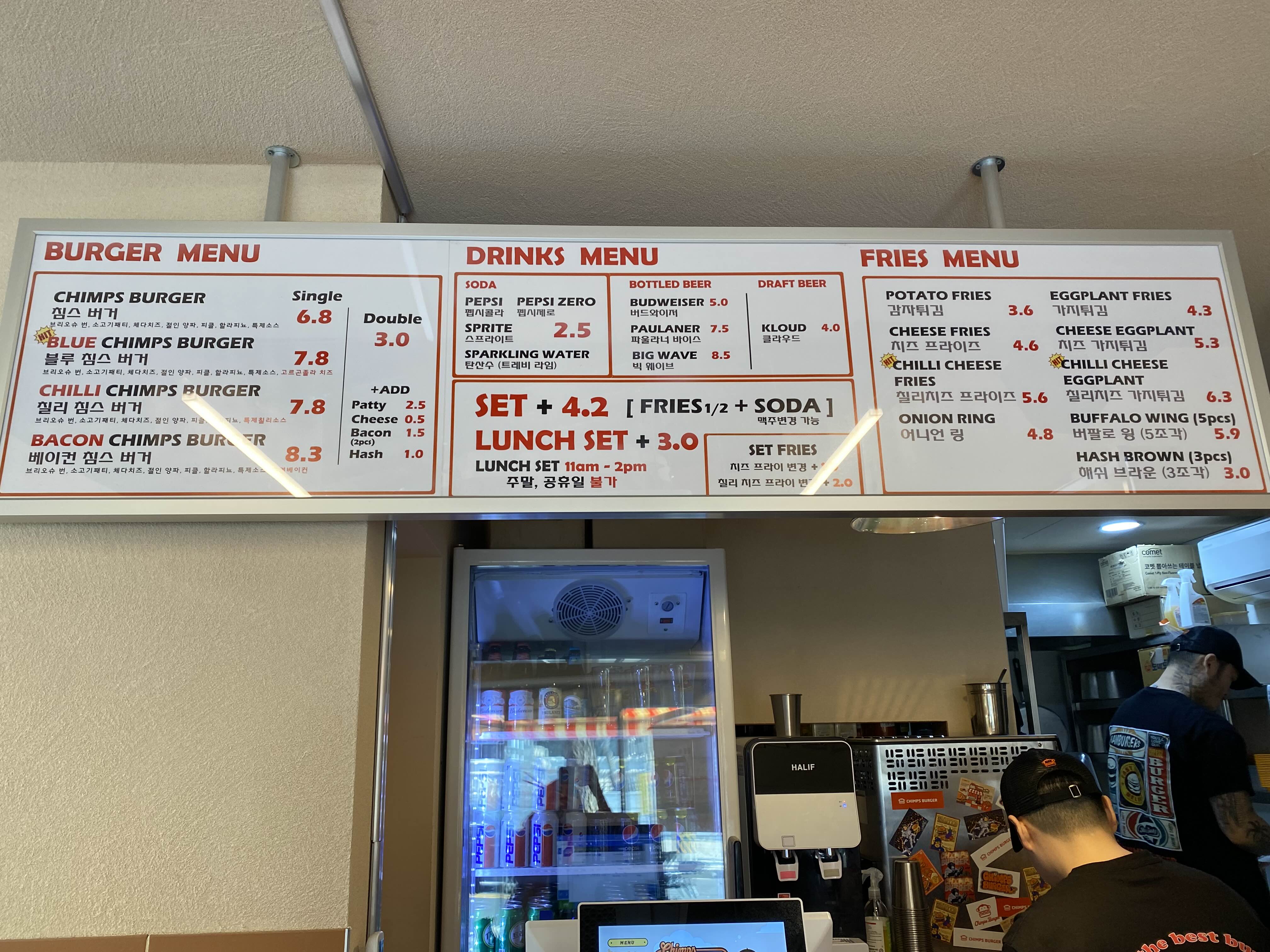 친구와 침스버거 하나, 블루침스버거 하나를 시켜