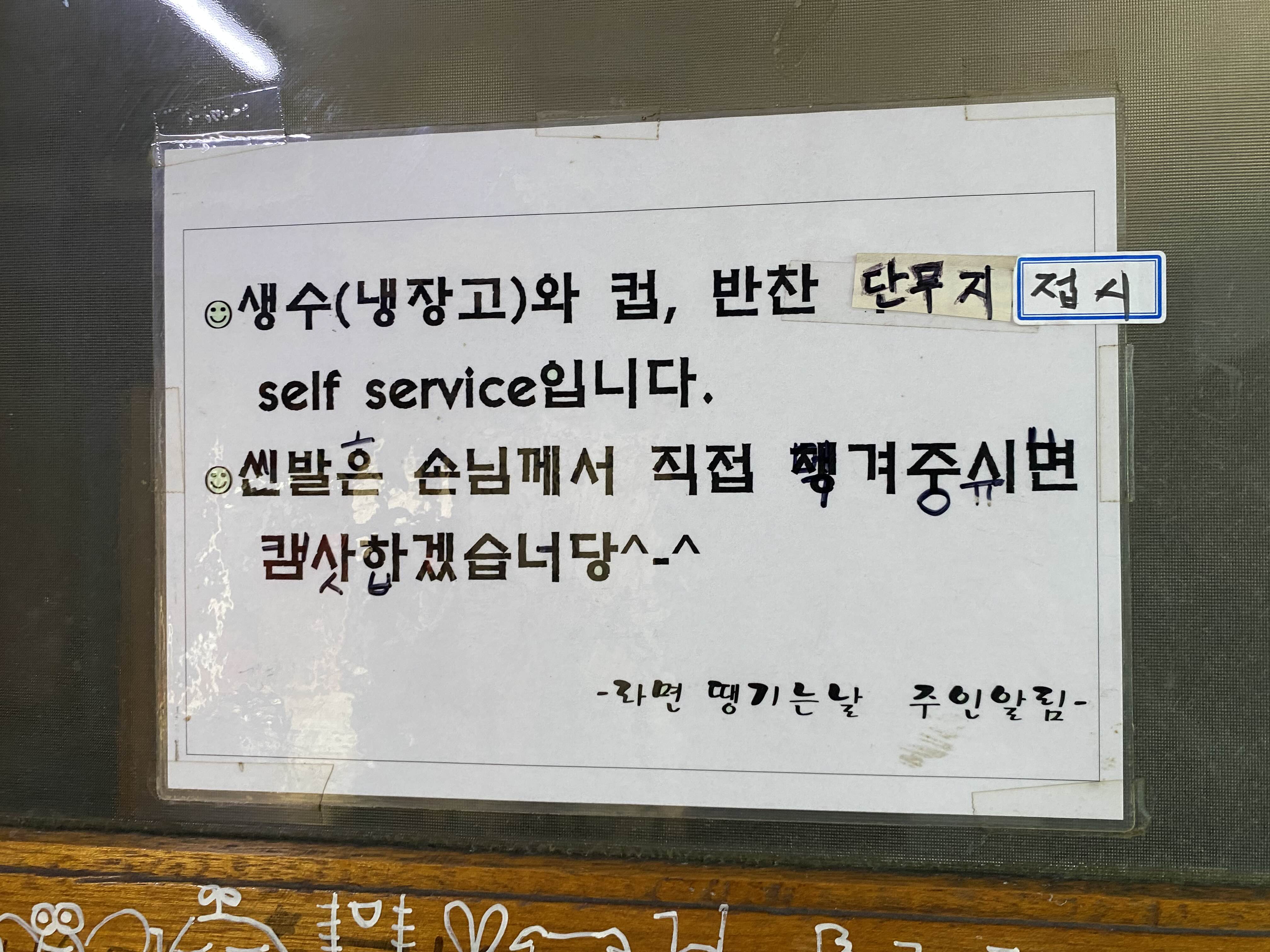 생수와 컵 , 단무지는 셀프서비스이다.