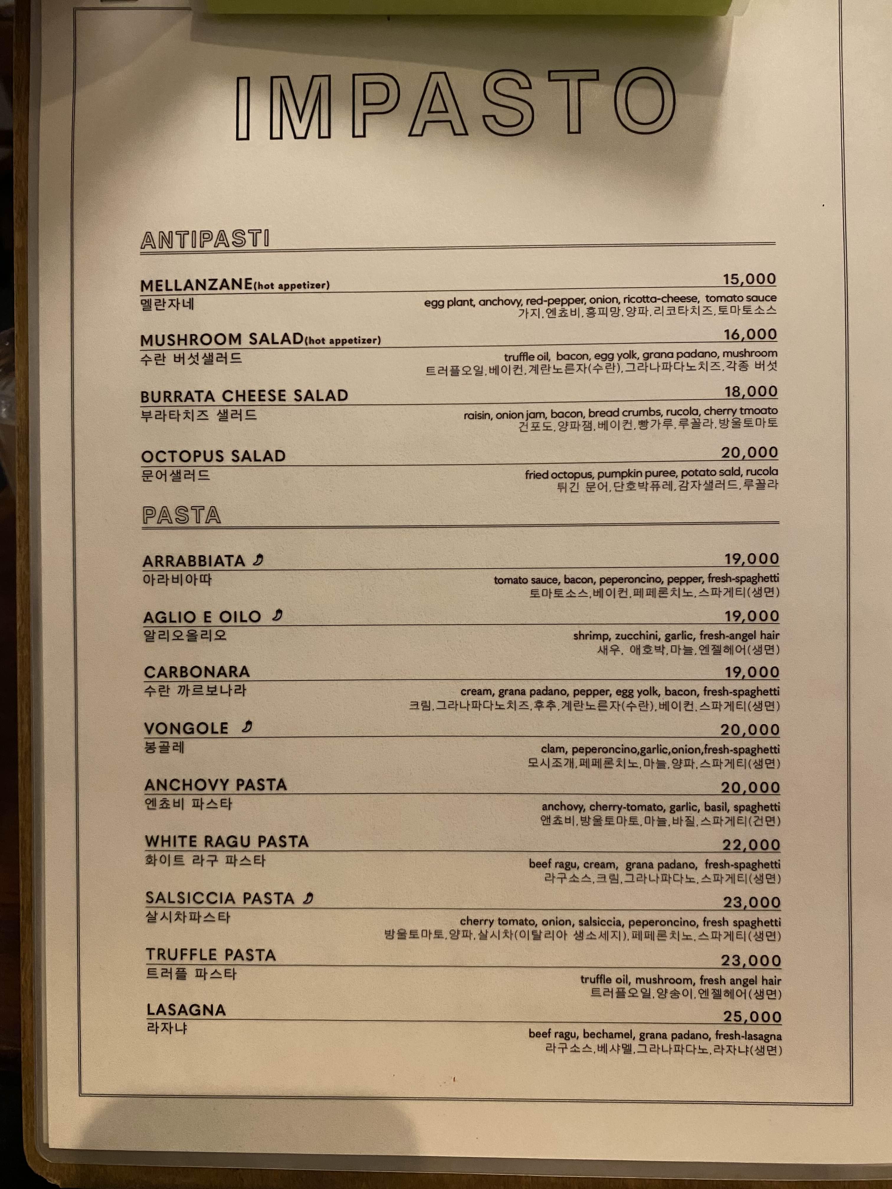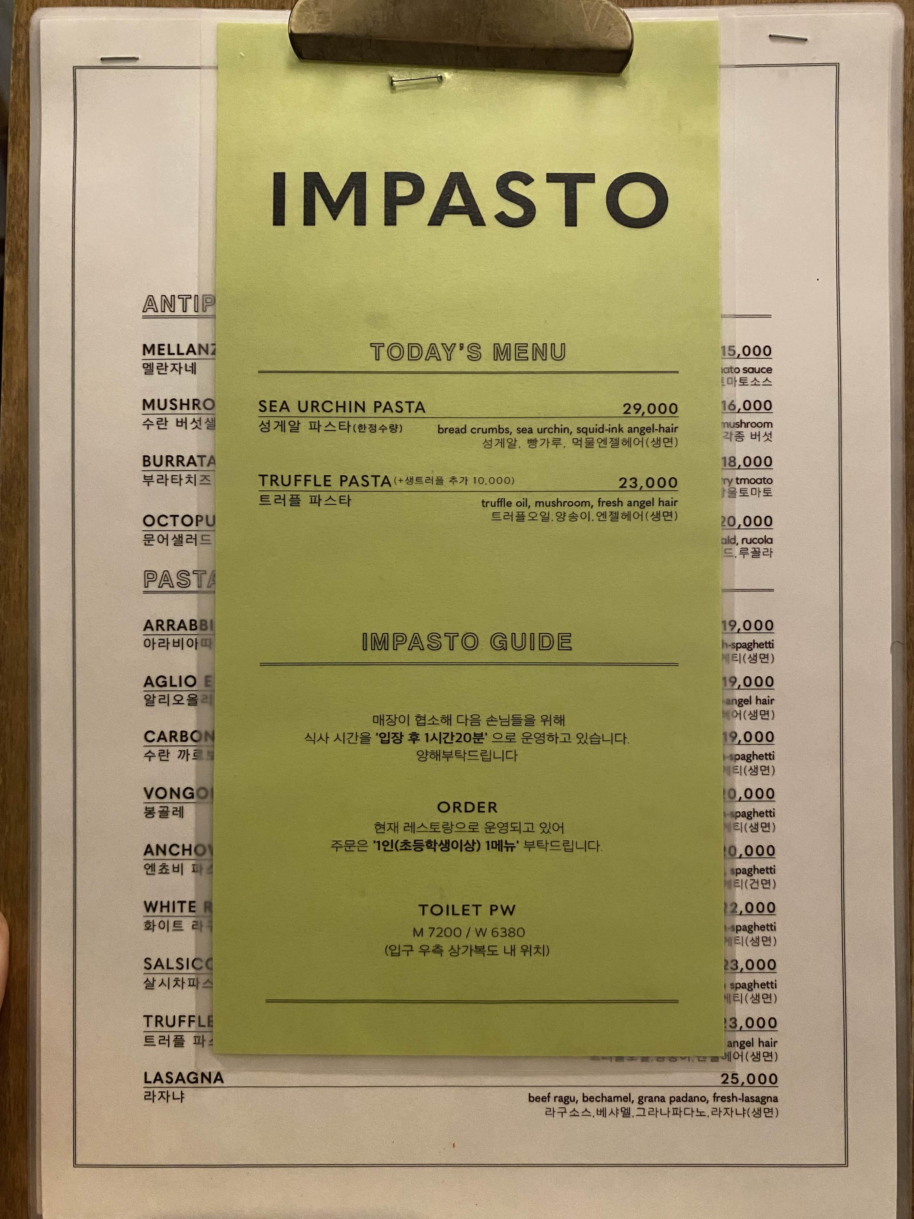 임파스토의 메뉴.