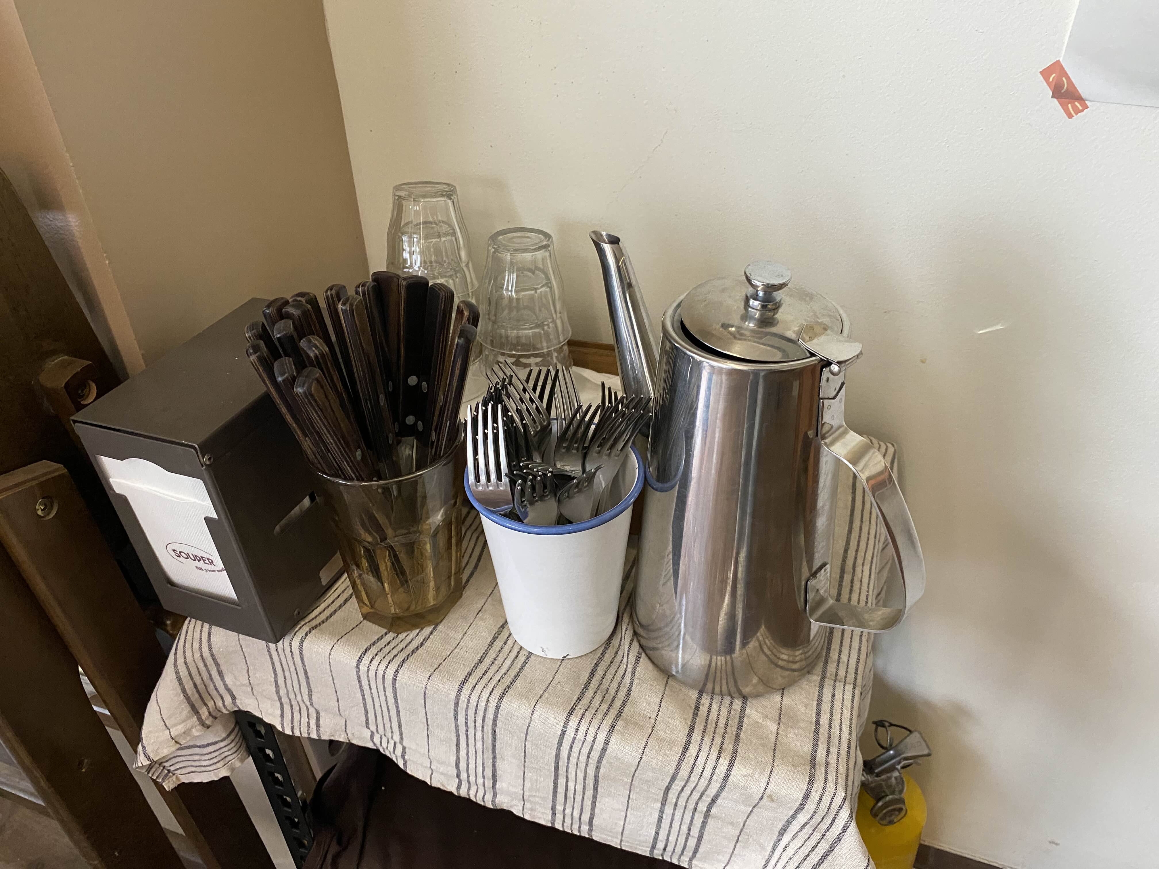 계산대 쪽에 물과 냅킨, 포크&나이프가