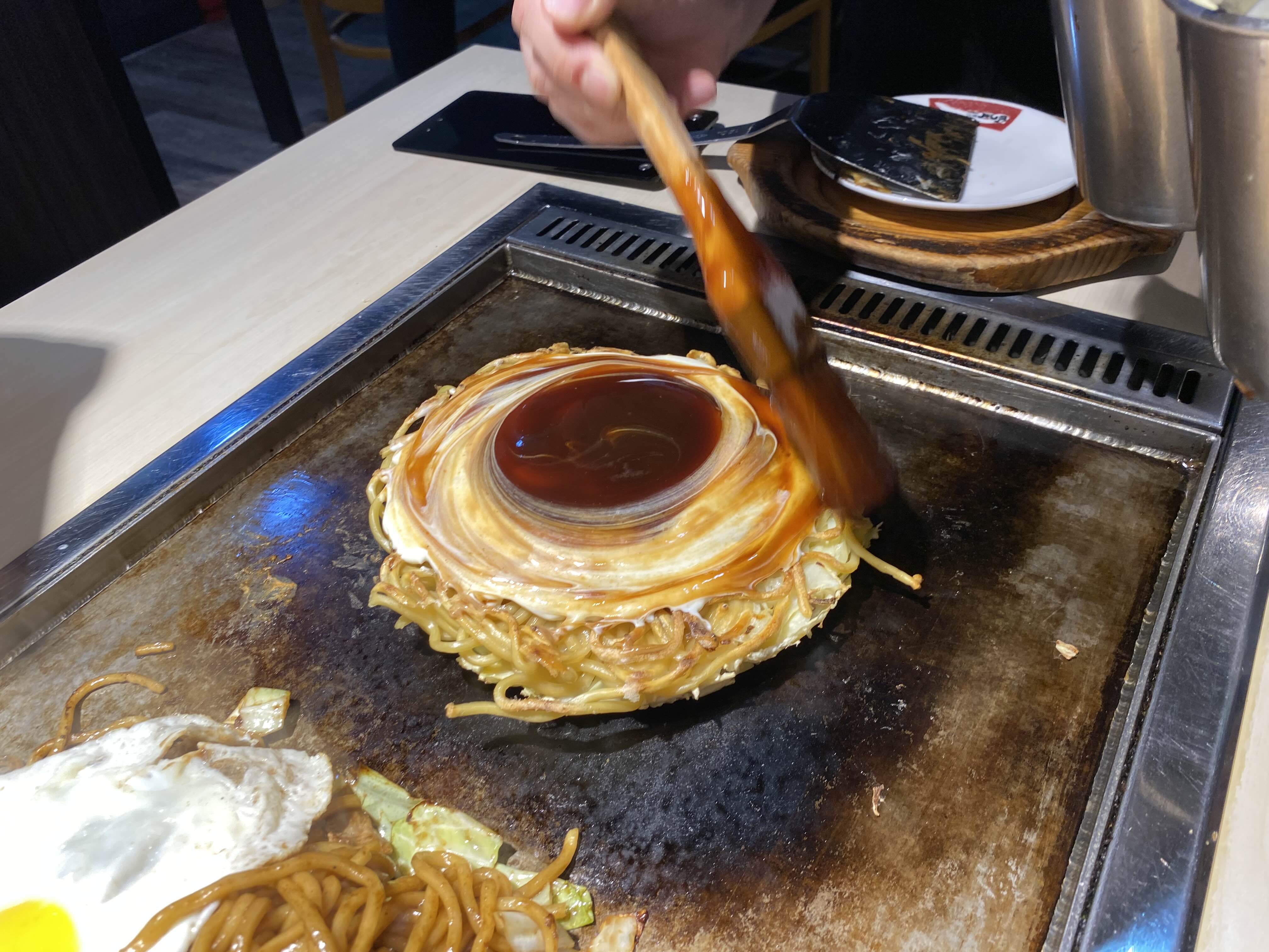 오코노미야끼는 자리에서 현란한 스냅과 함께