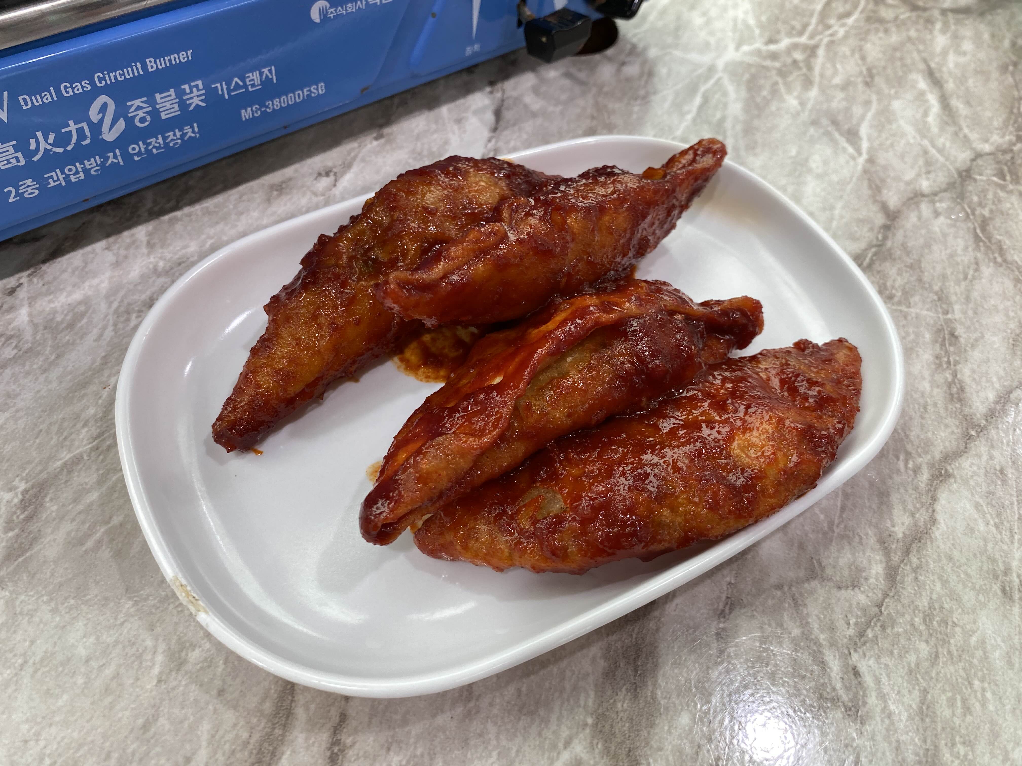 매콤한 양념에 버무려진 야끼만두 같은 군만두는