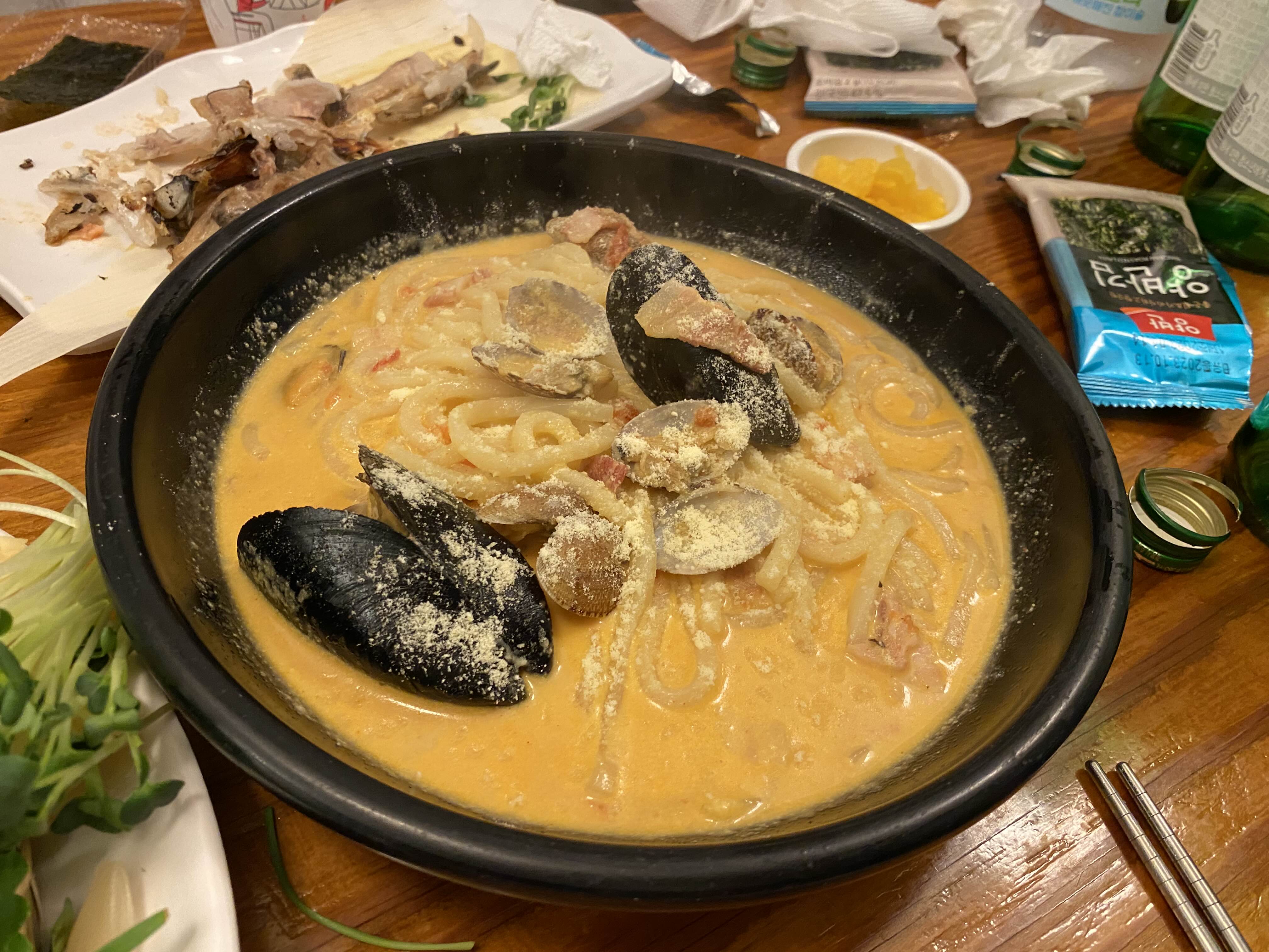 다들 매콤한 토마토 홍합을 먹은 뒤