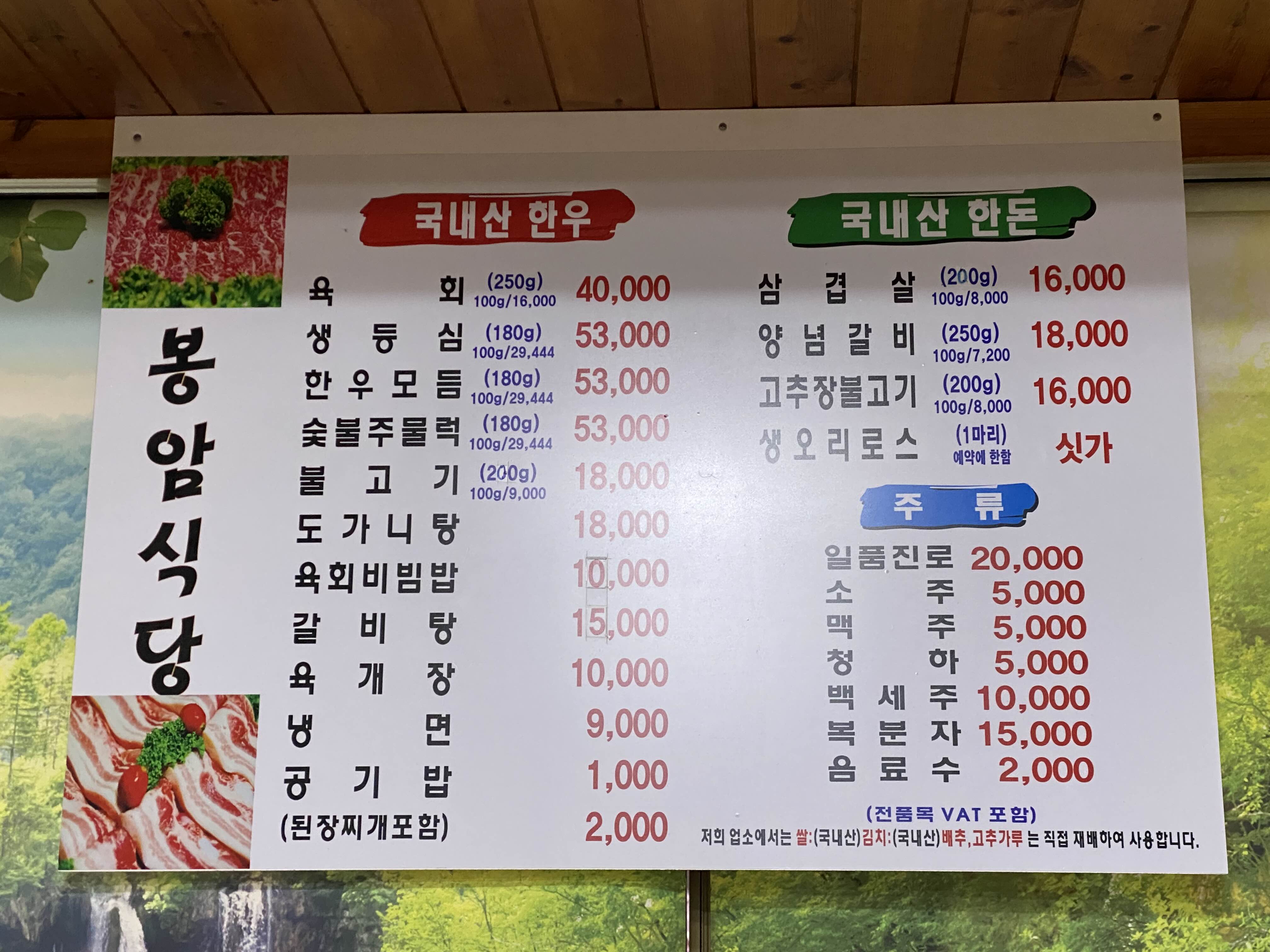 봉암식당은 국내산 한우와 국내산 한돈,