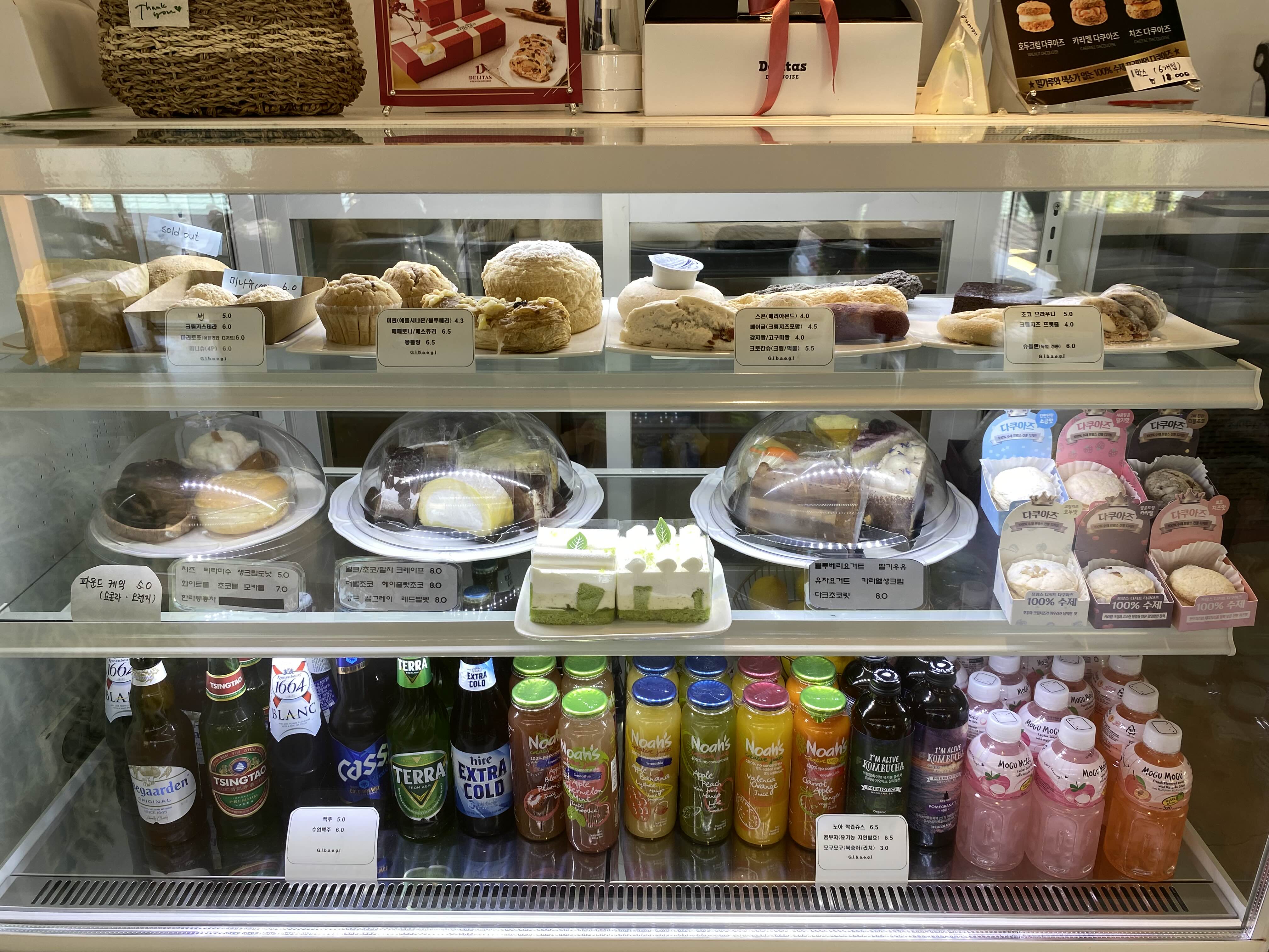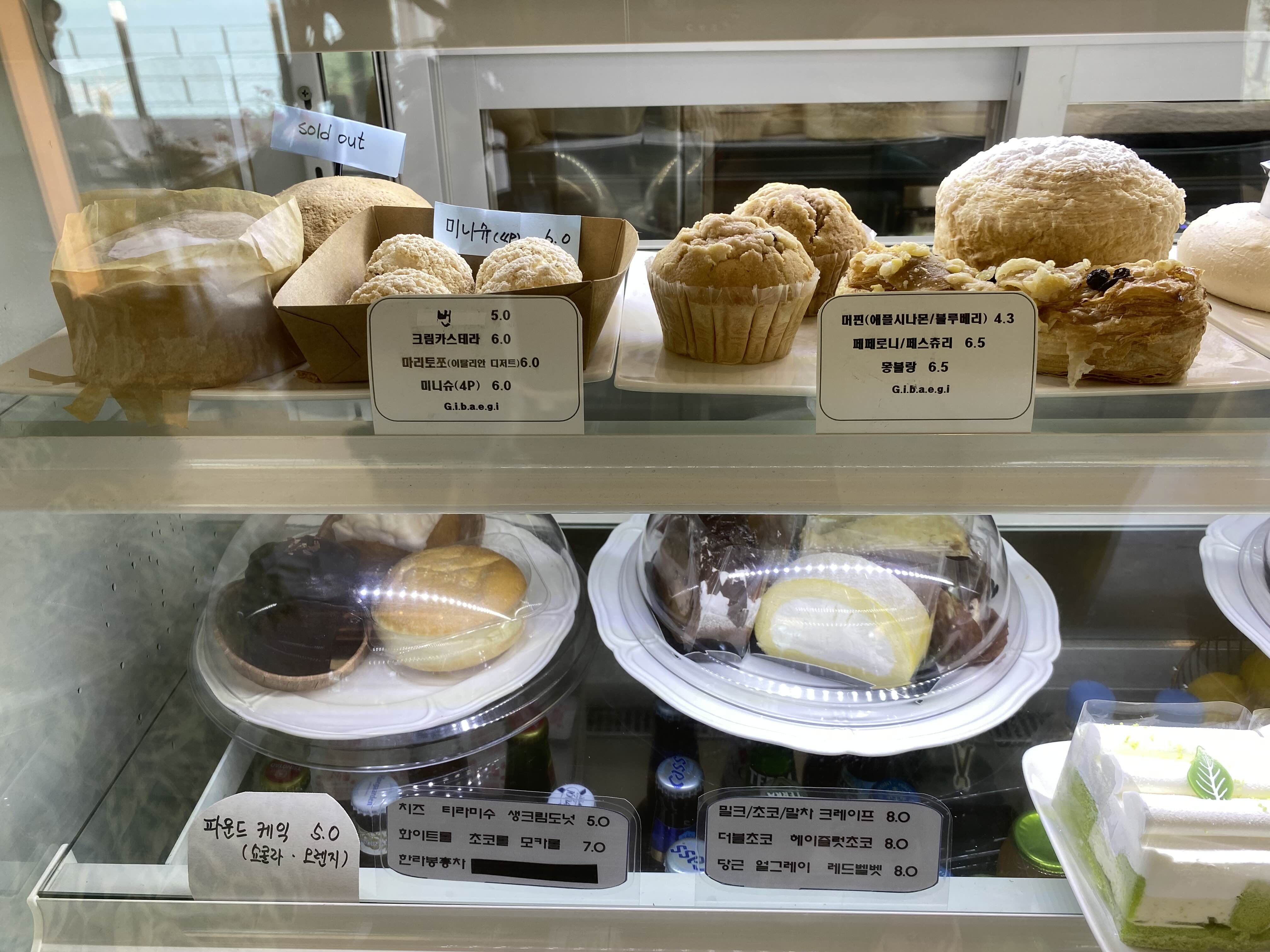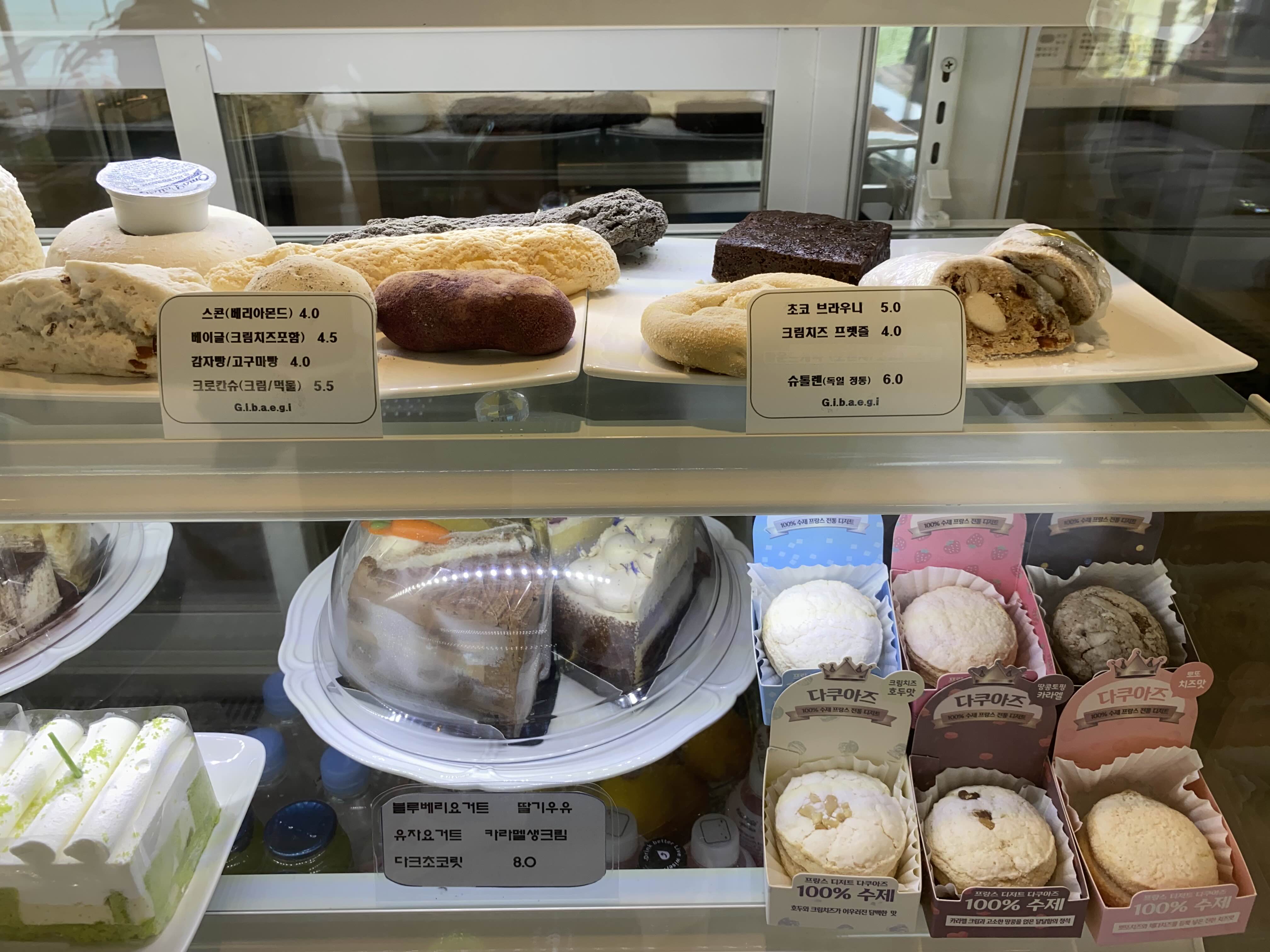 꽤 다양한 빵 종류와 케이크 류가 진열되어 있는데