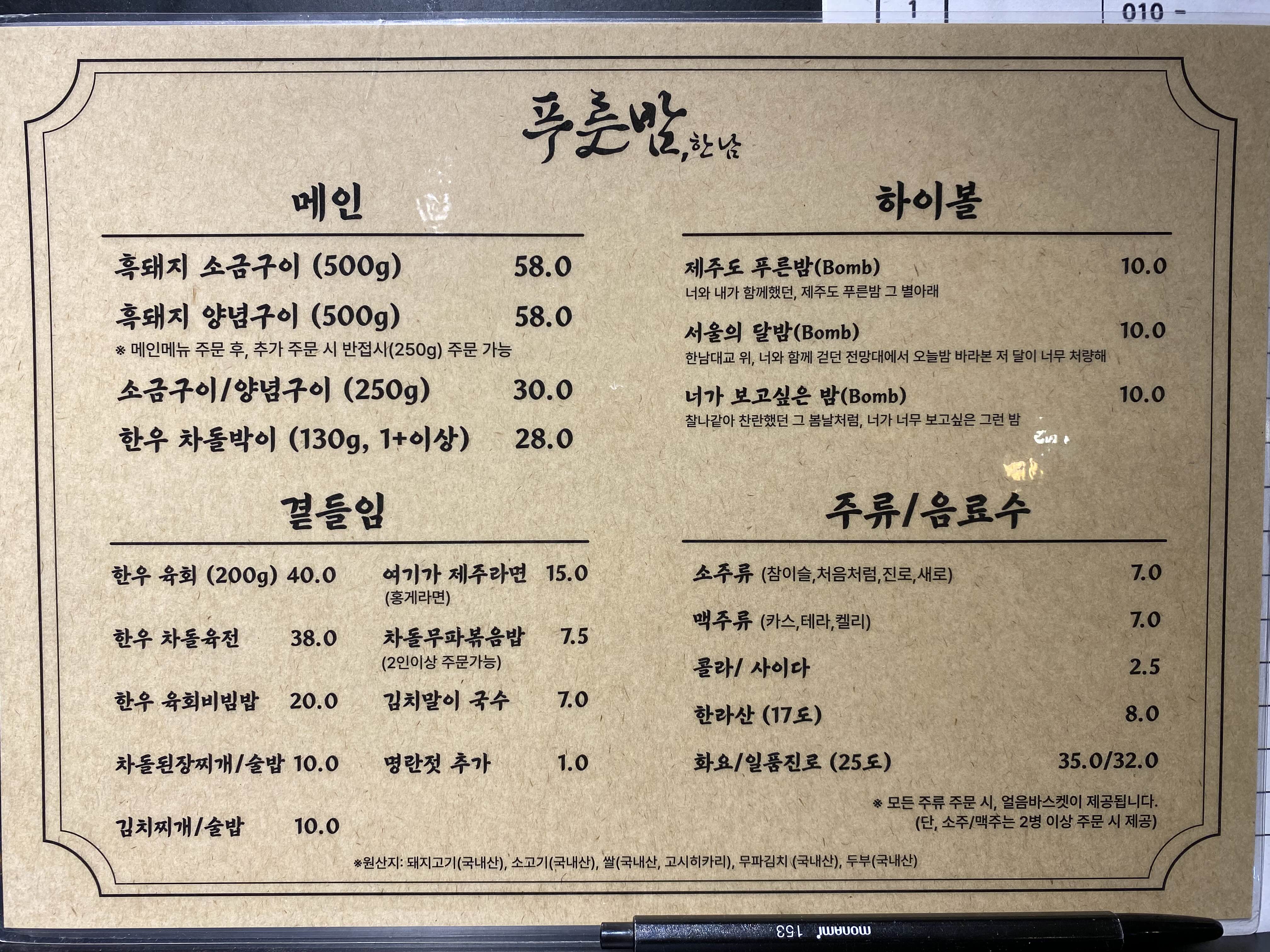푸른밤 한남의 메뉴판