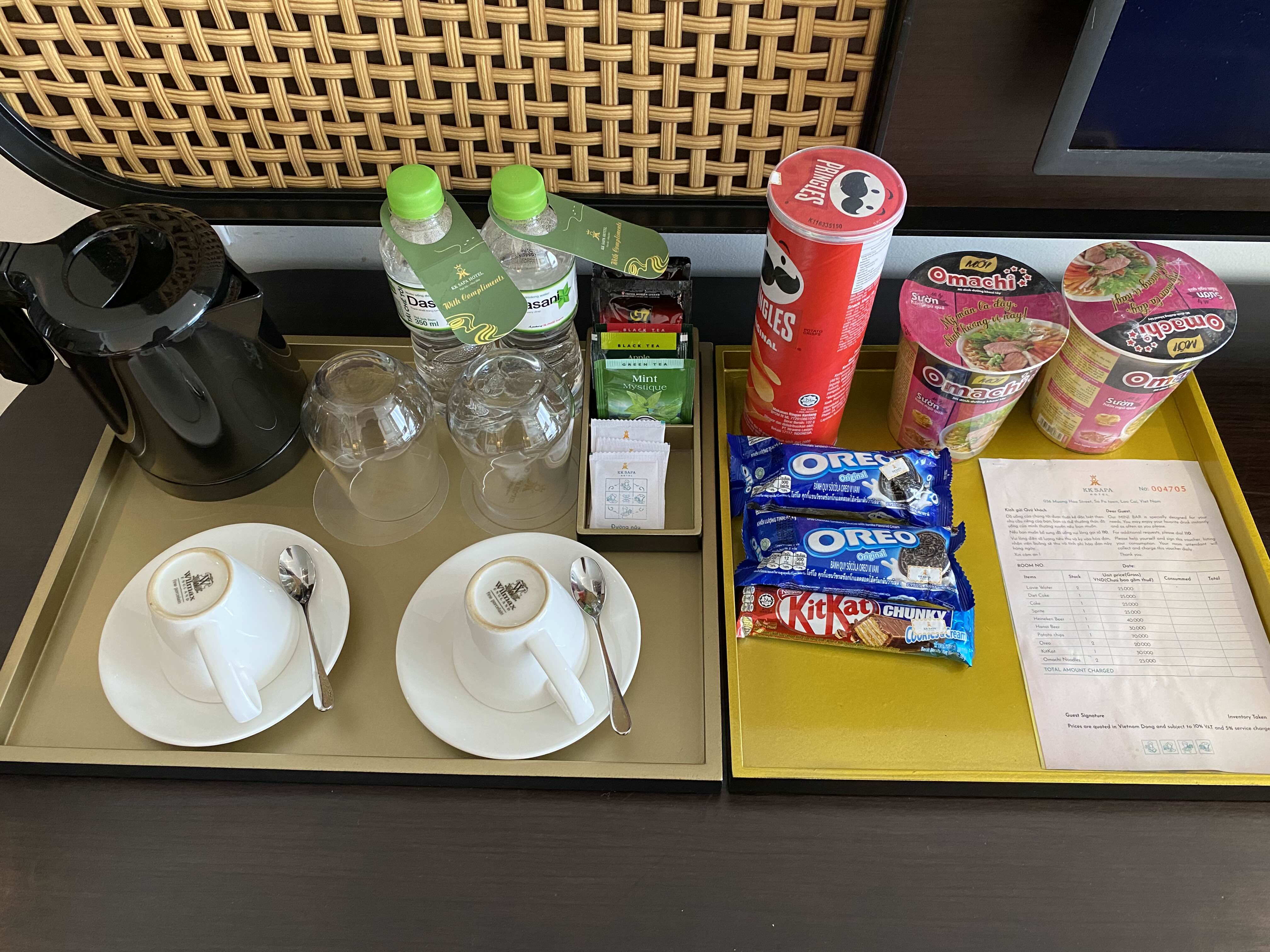 커피포트와 생수, 차 티백이 준비되어 있고