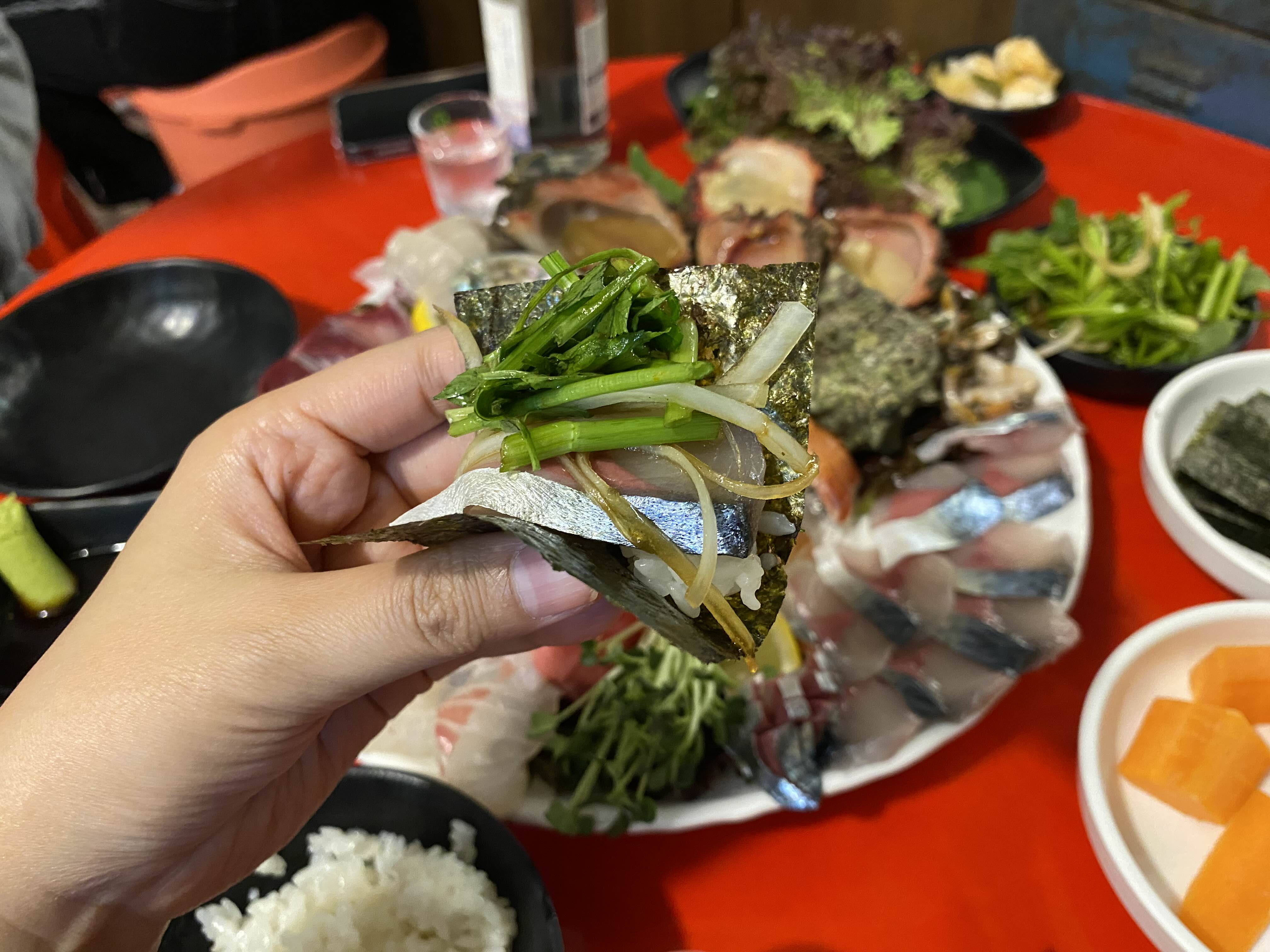 고등어회는 이렇게 김에 밥을 얹고