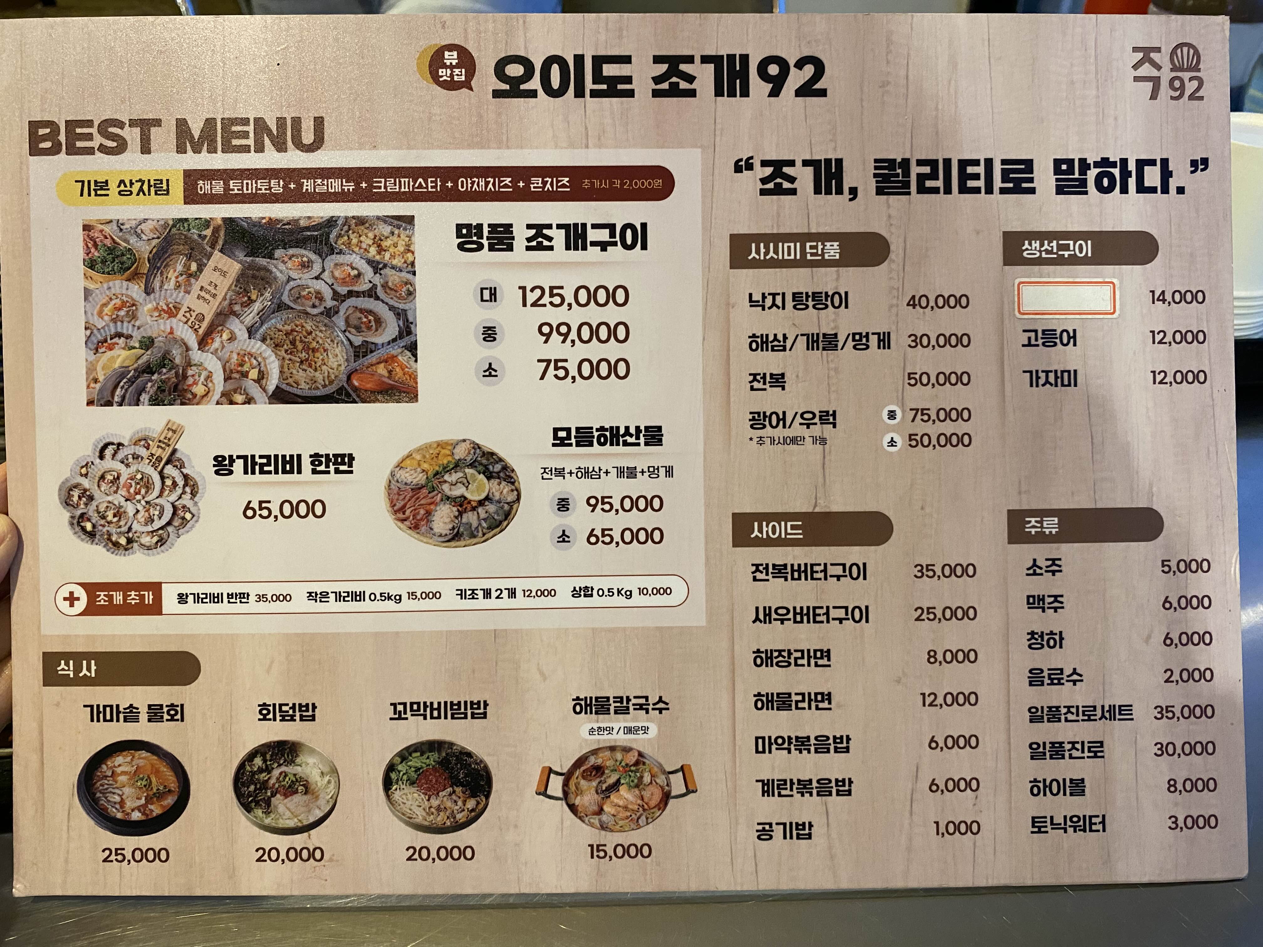 오이도 조개92 메뉴.