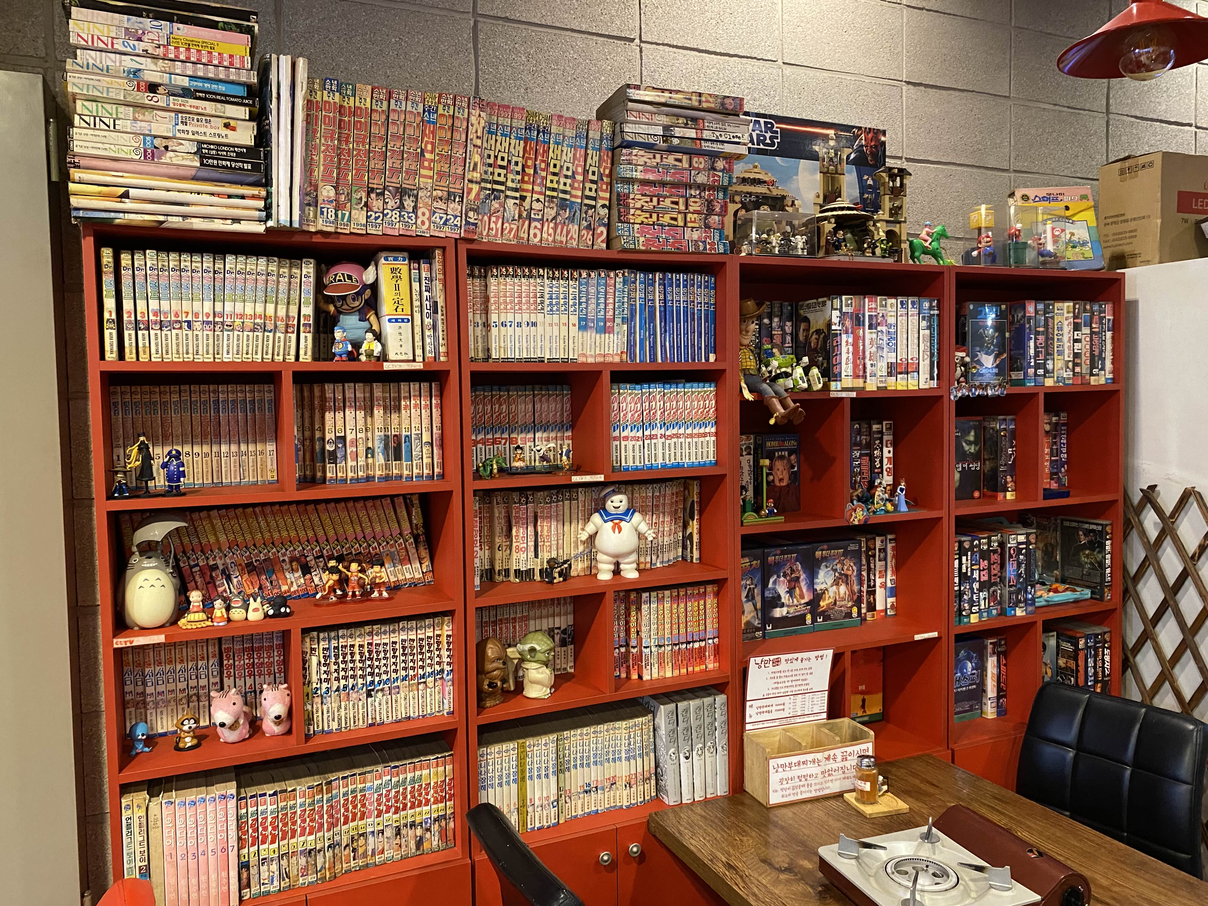 만화책과 비디오테이프가 빼곡하게 전시되어 있다.