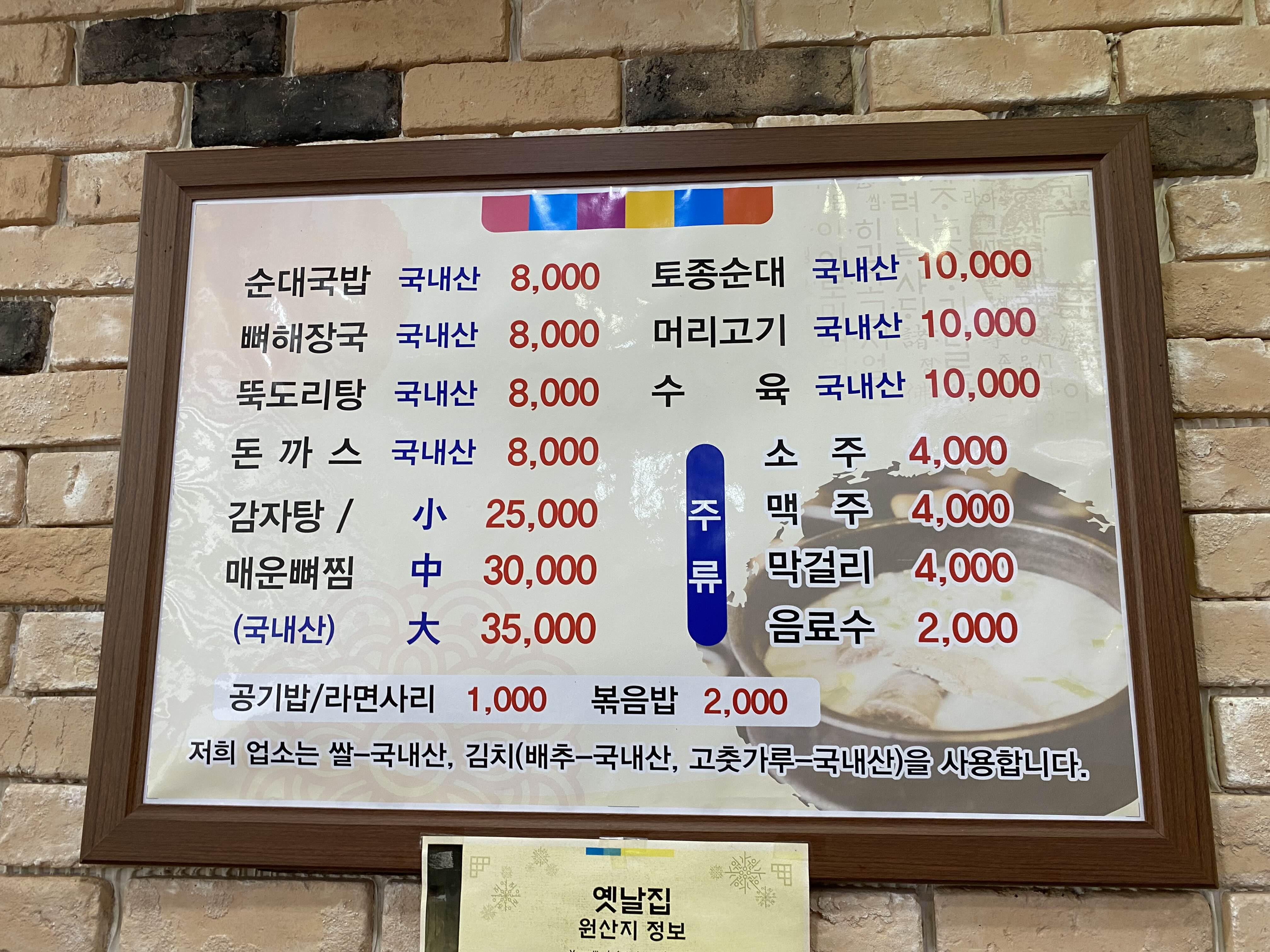 옛날집 메뉴.