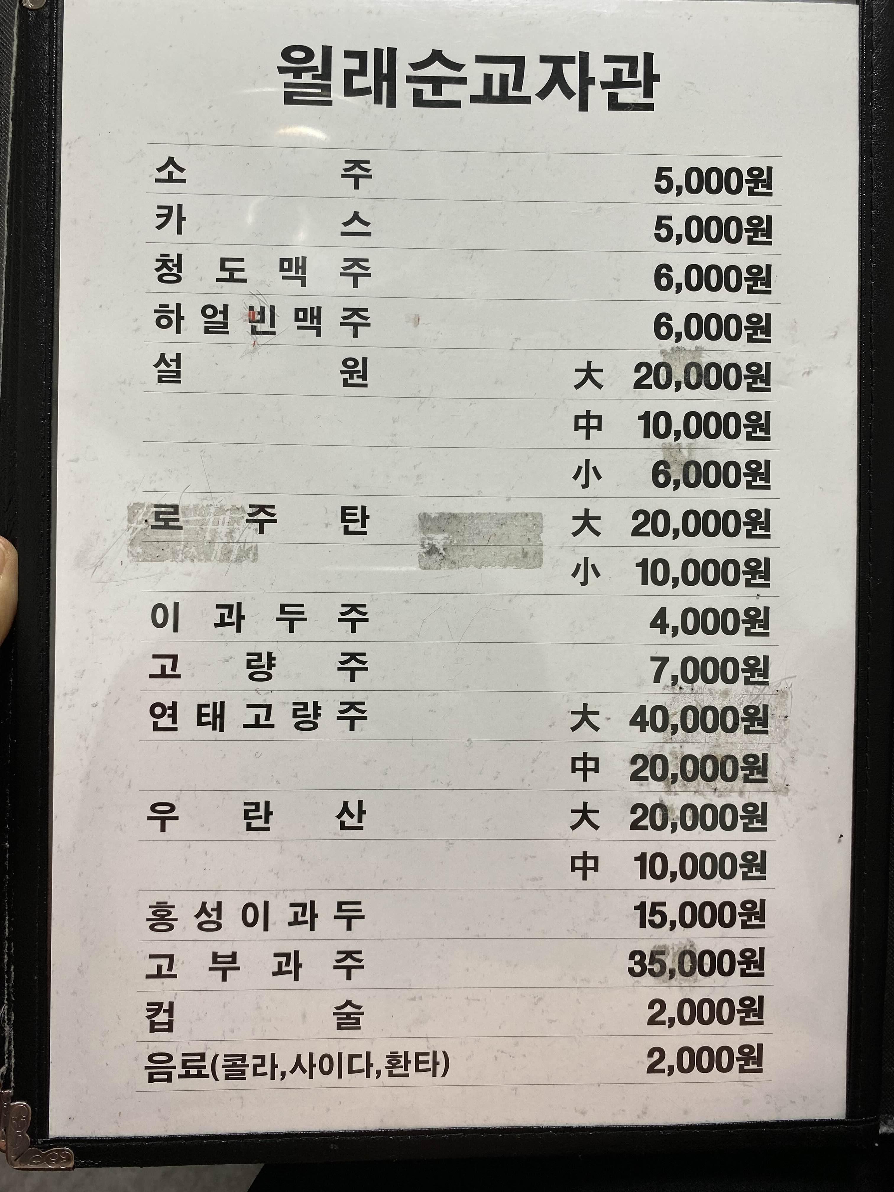 월래순교자관 주류메뉴판.