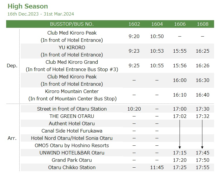 ✔️ 키로로 → 오타루 버스 시간표