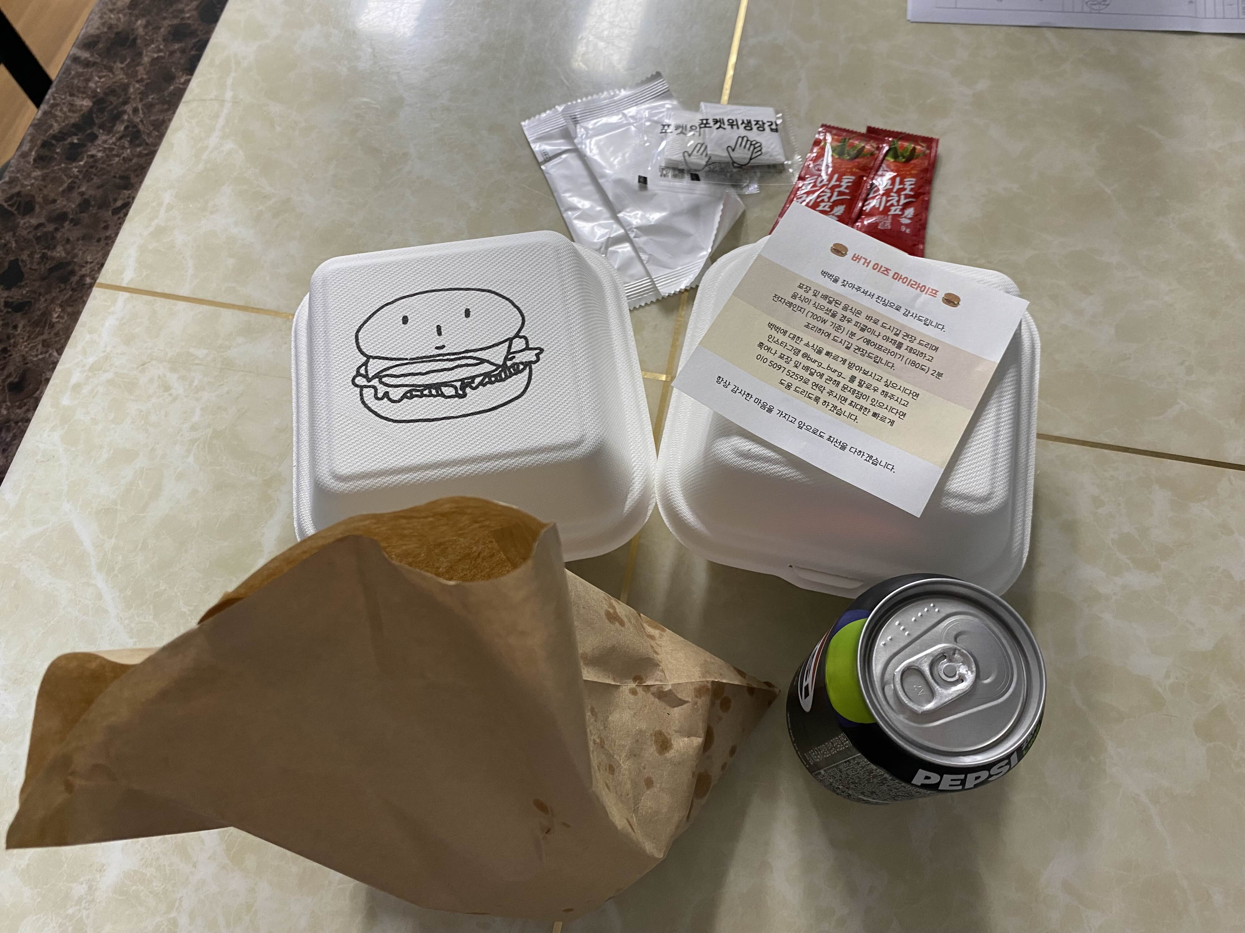 벅벅 2개와 오리지널 프라이, 제로 펩시.