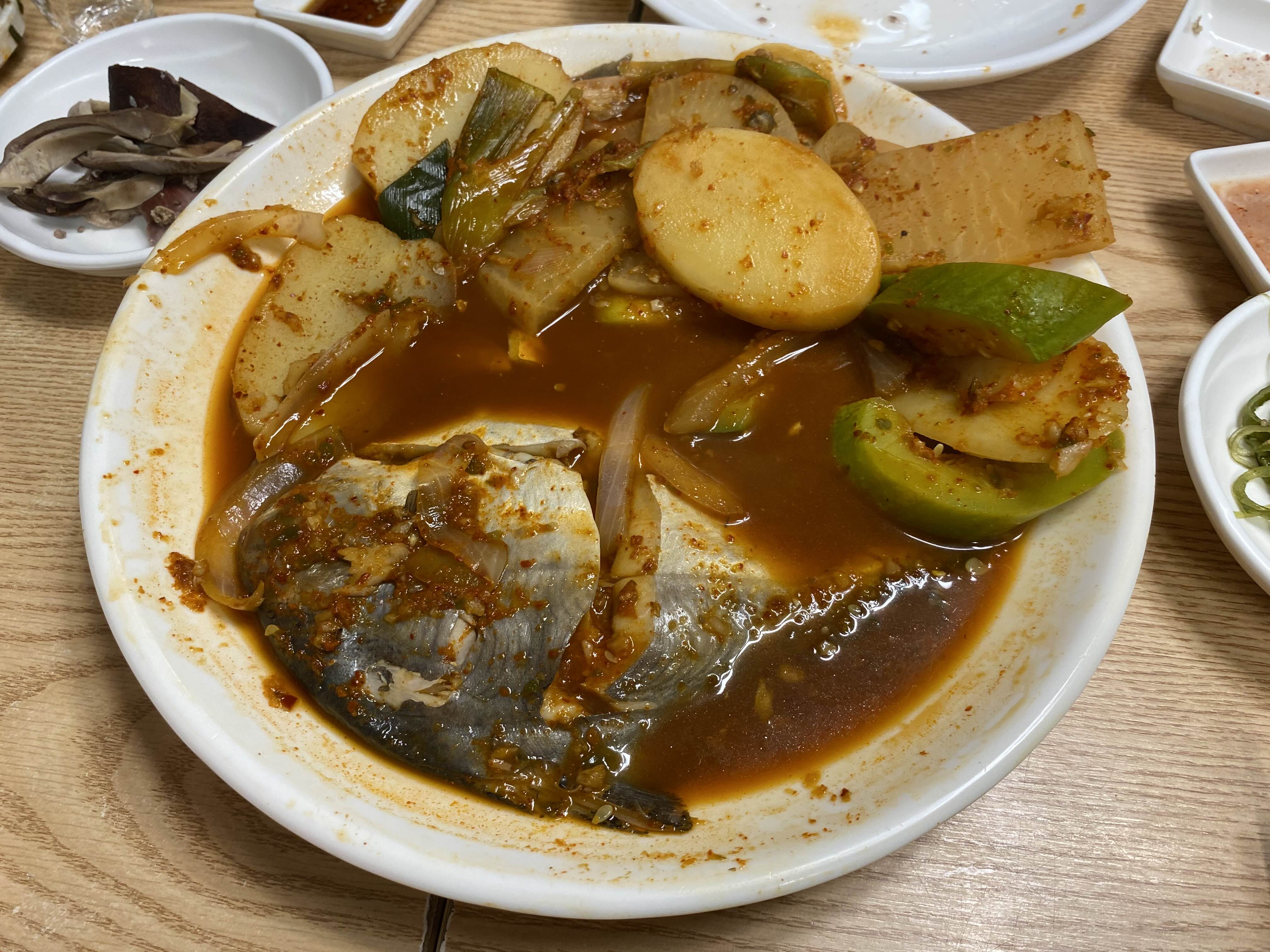 이게 병어찜인가 감자, 무 조림인가 싶은데