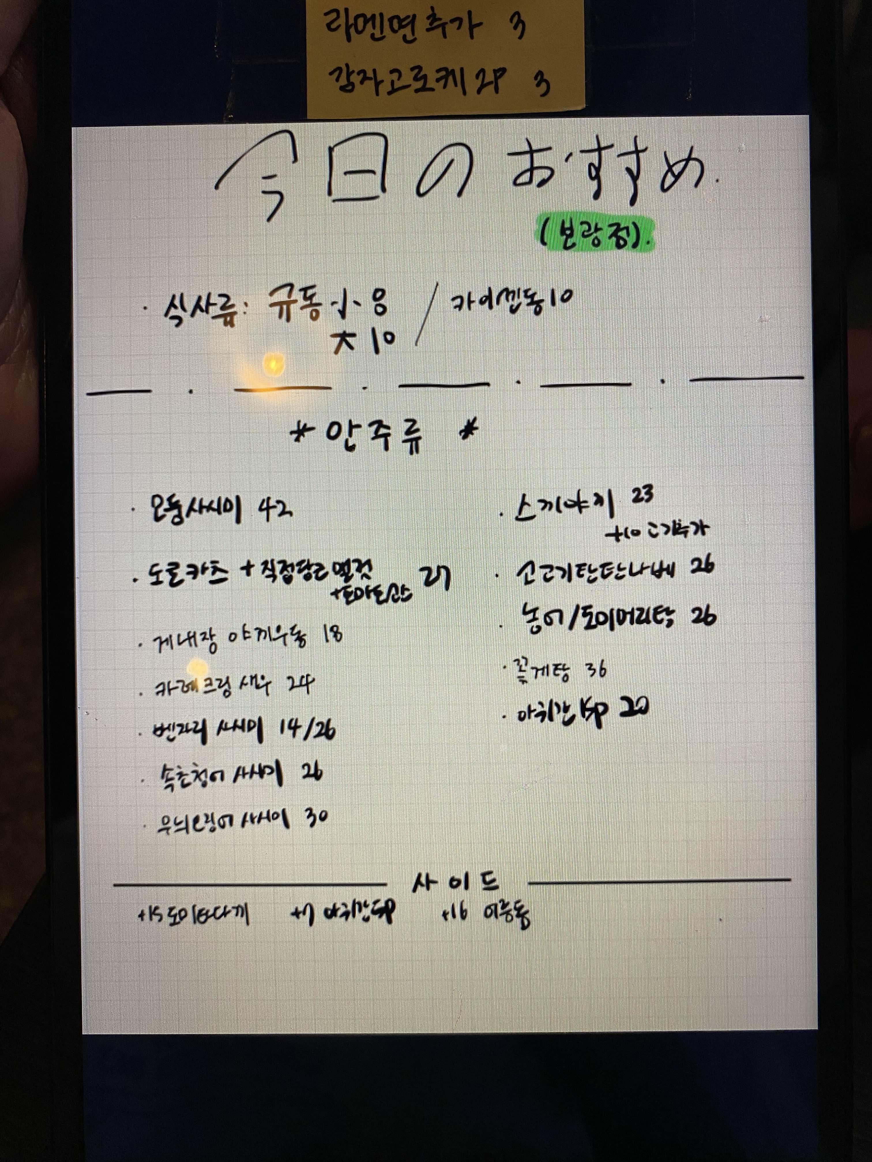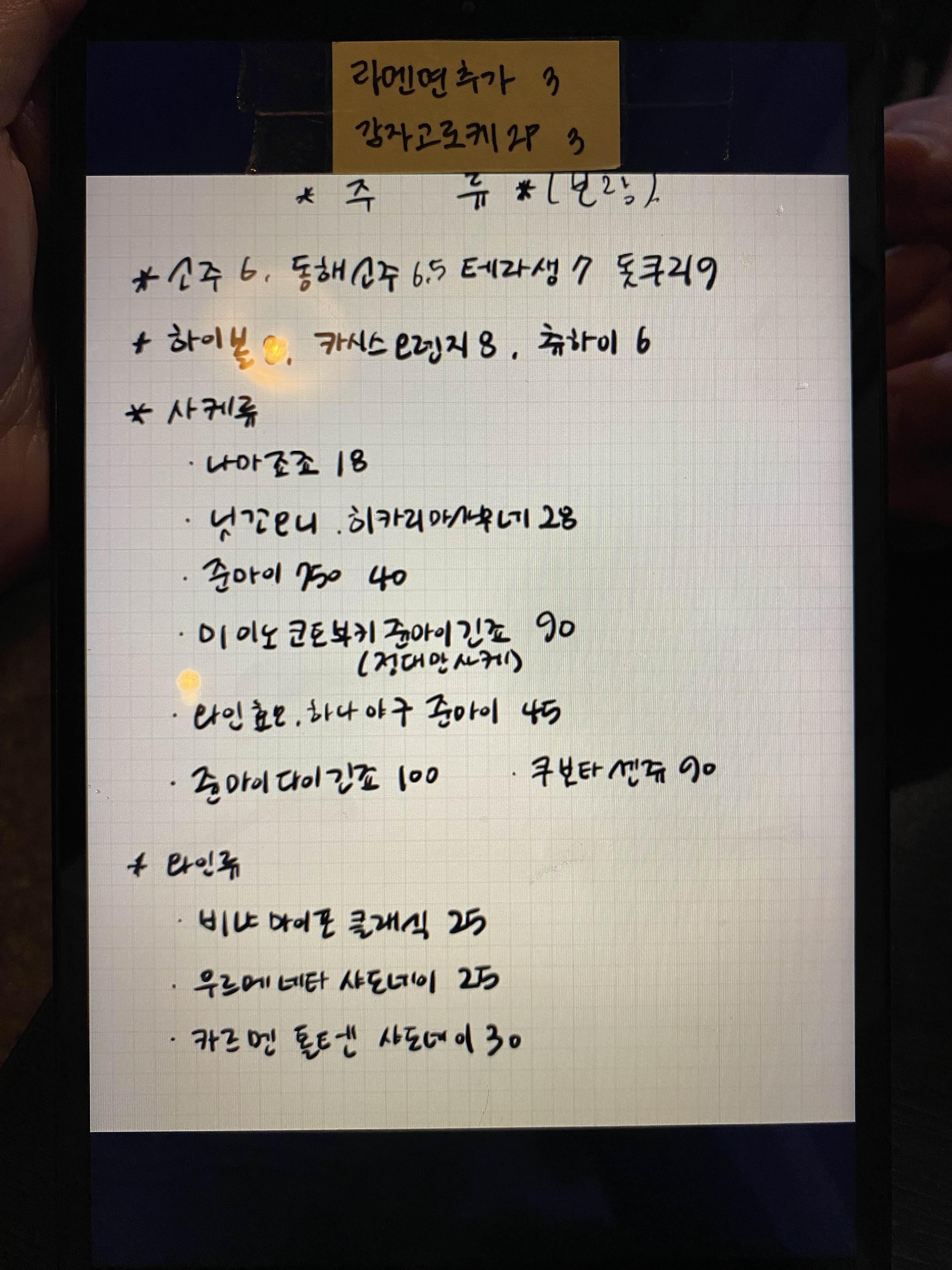 패드 메모장에 친필로 적힌 메뉴판이;