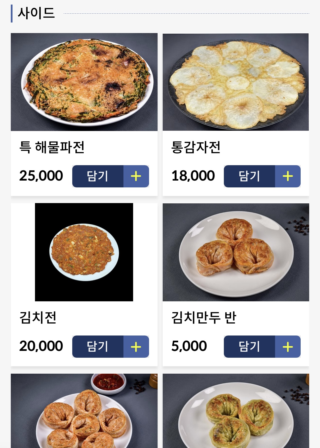사이드로는 해물파전, 통감자전, 김치전,