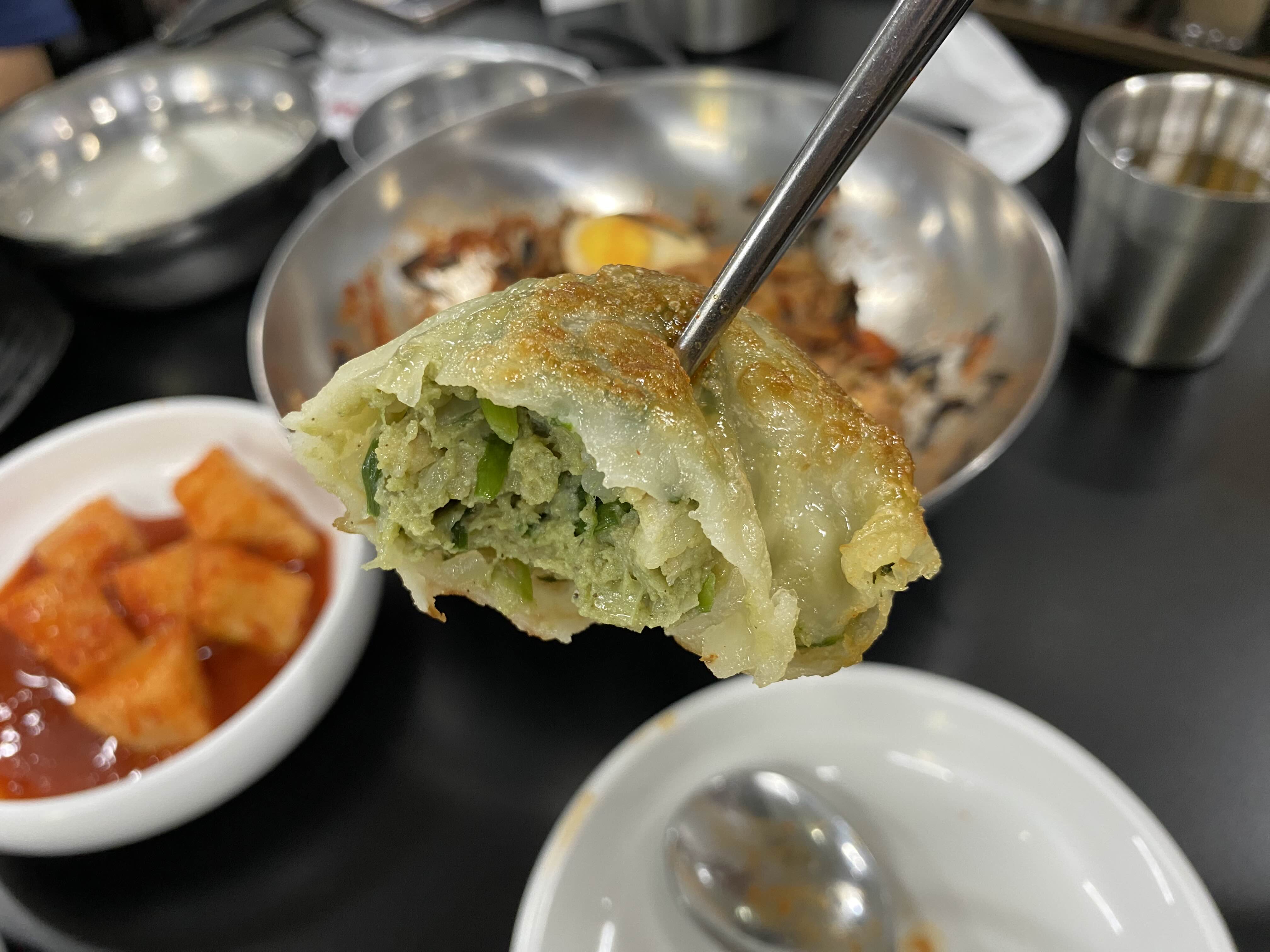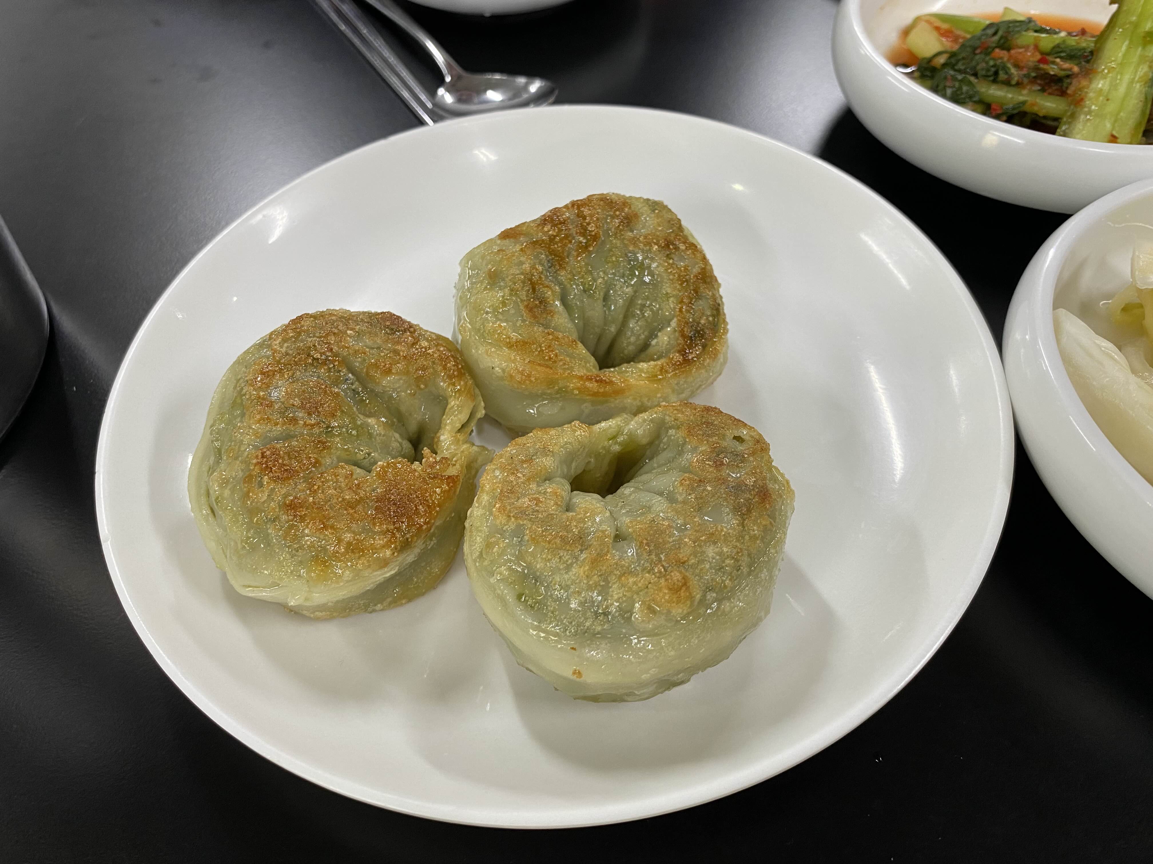 김치군만두, 고기군만두, 쑥갓무침,