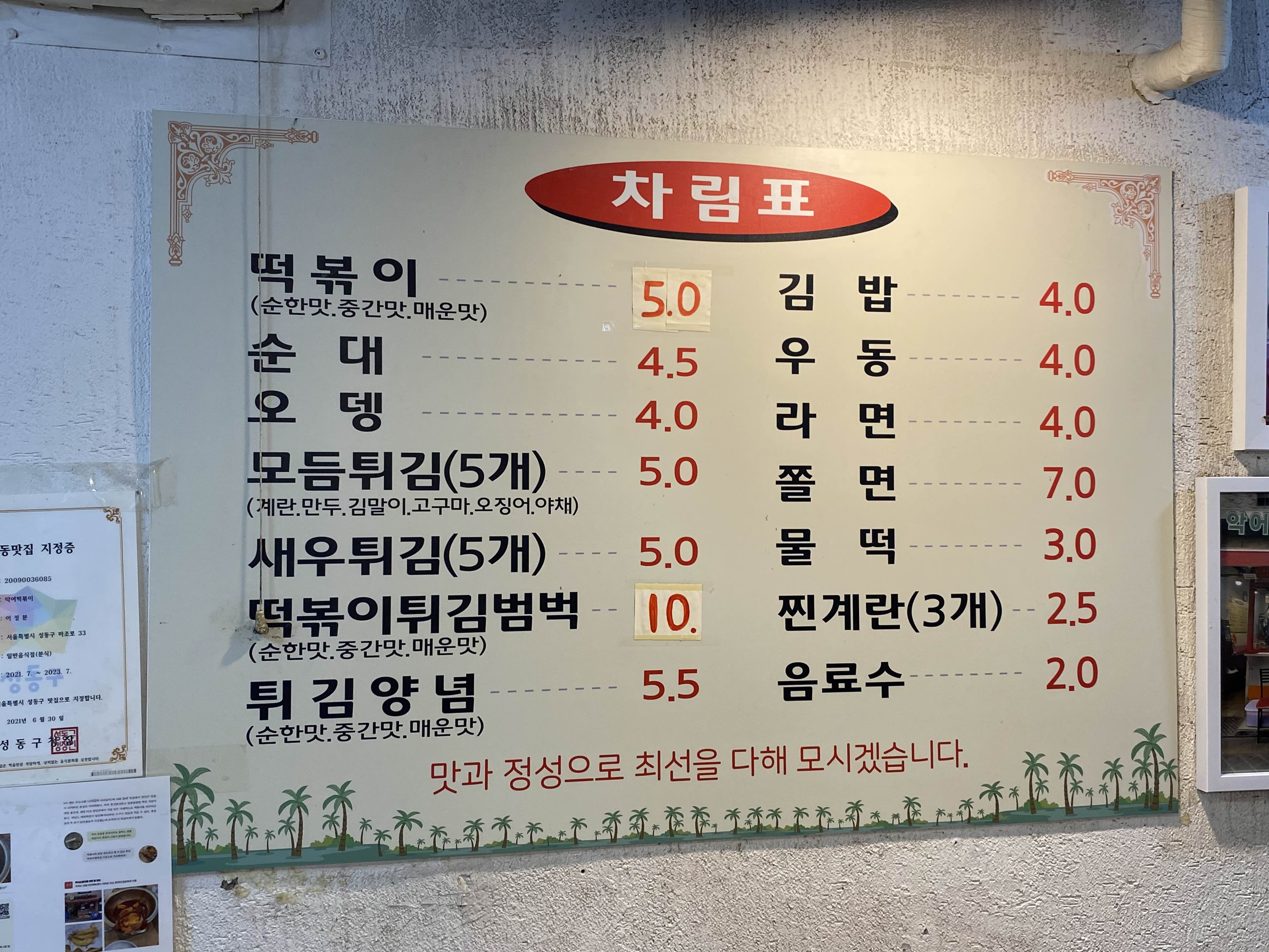 물떡과 오뎅의 개수에 다라 가격이 조금씩 다르다.