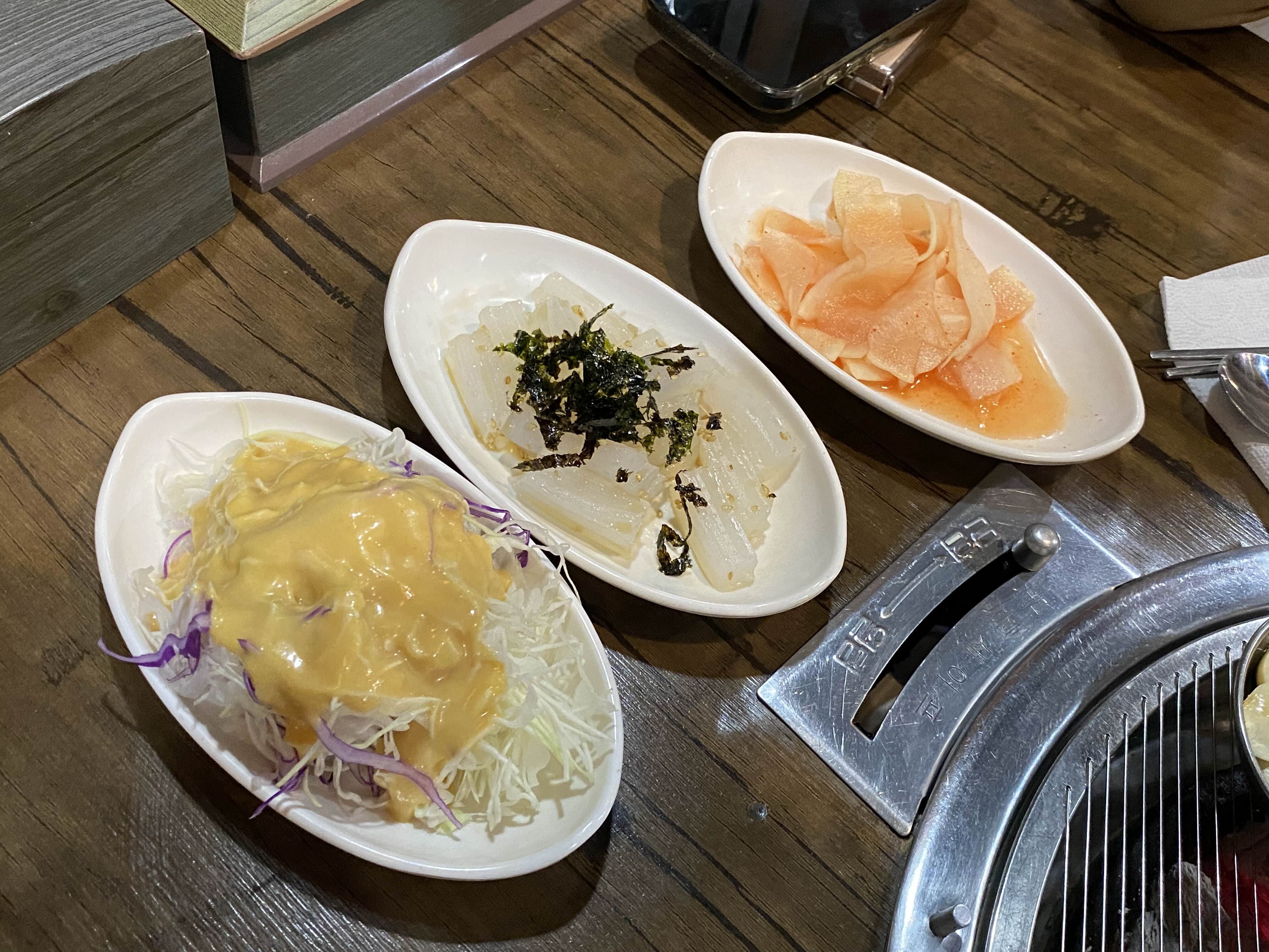 밑찬은 샐러드부터 청포묵, 무김치, 파절이 정도.