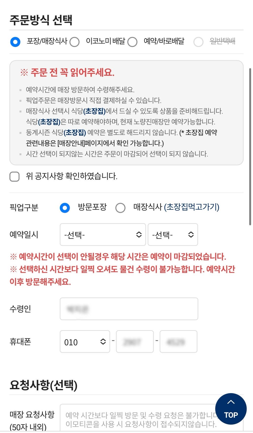 방문포장으로 선택하고 미리 시간까지 예약하면