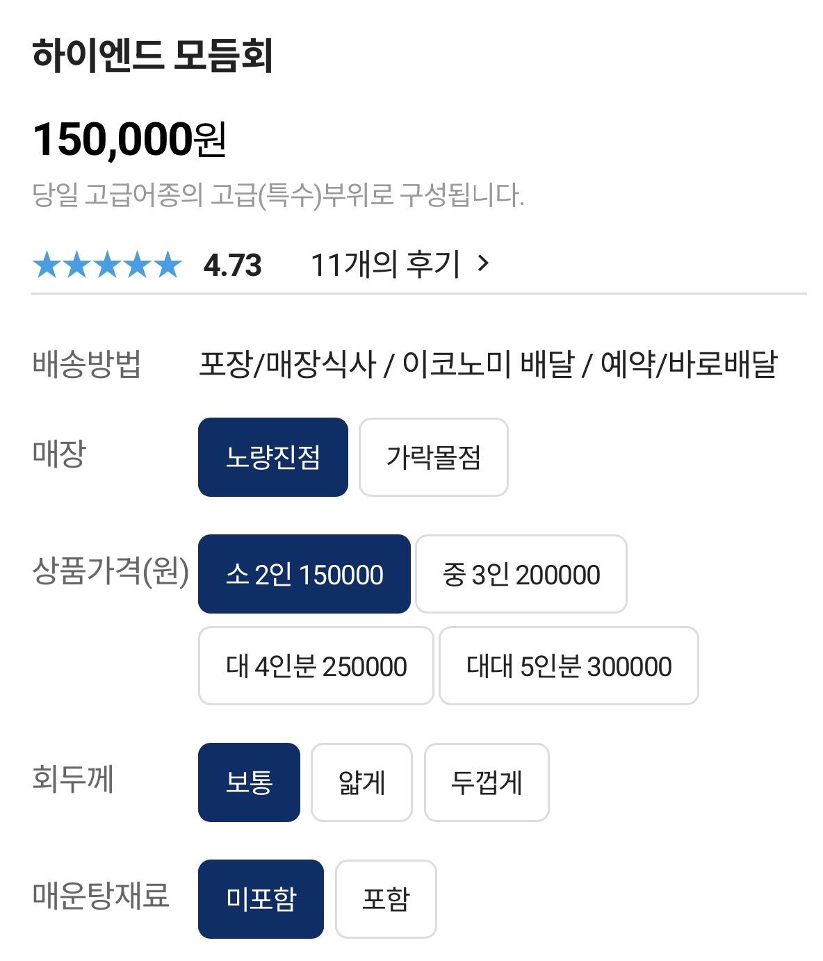 매운탕 재료 포함 여부도 선택 가능하다.
