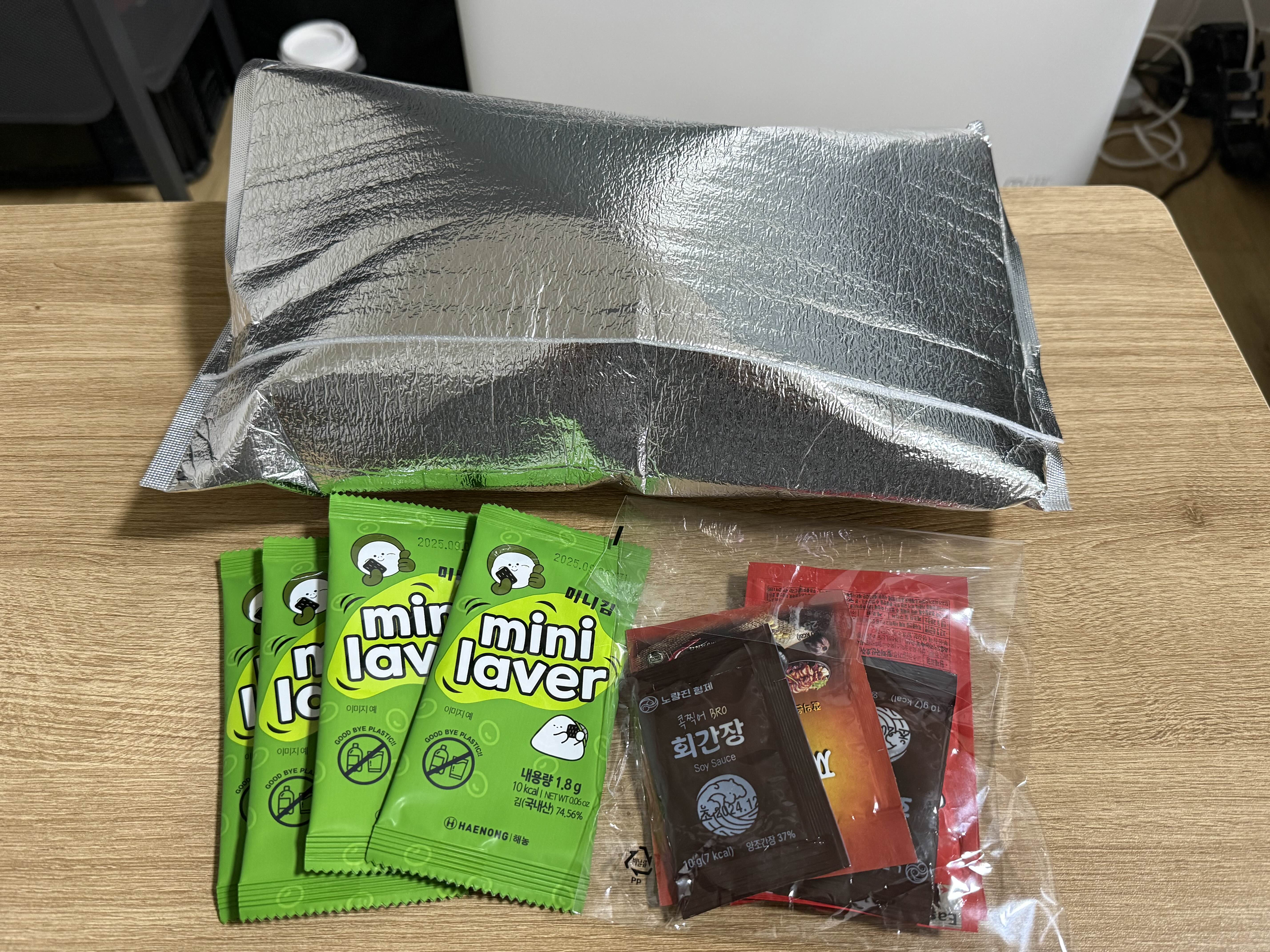 보냉 포장된 모둠회와 김 4 봉지,