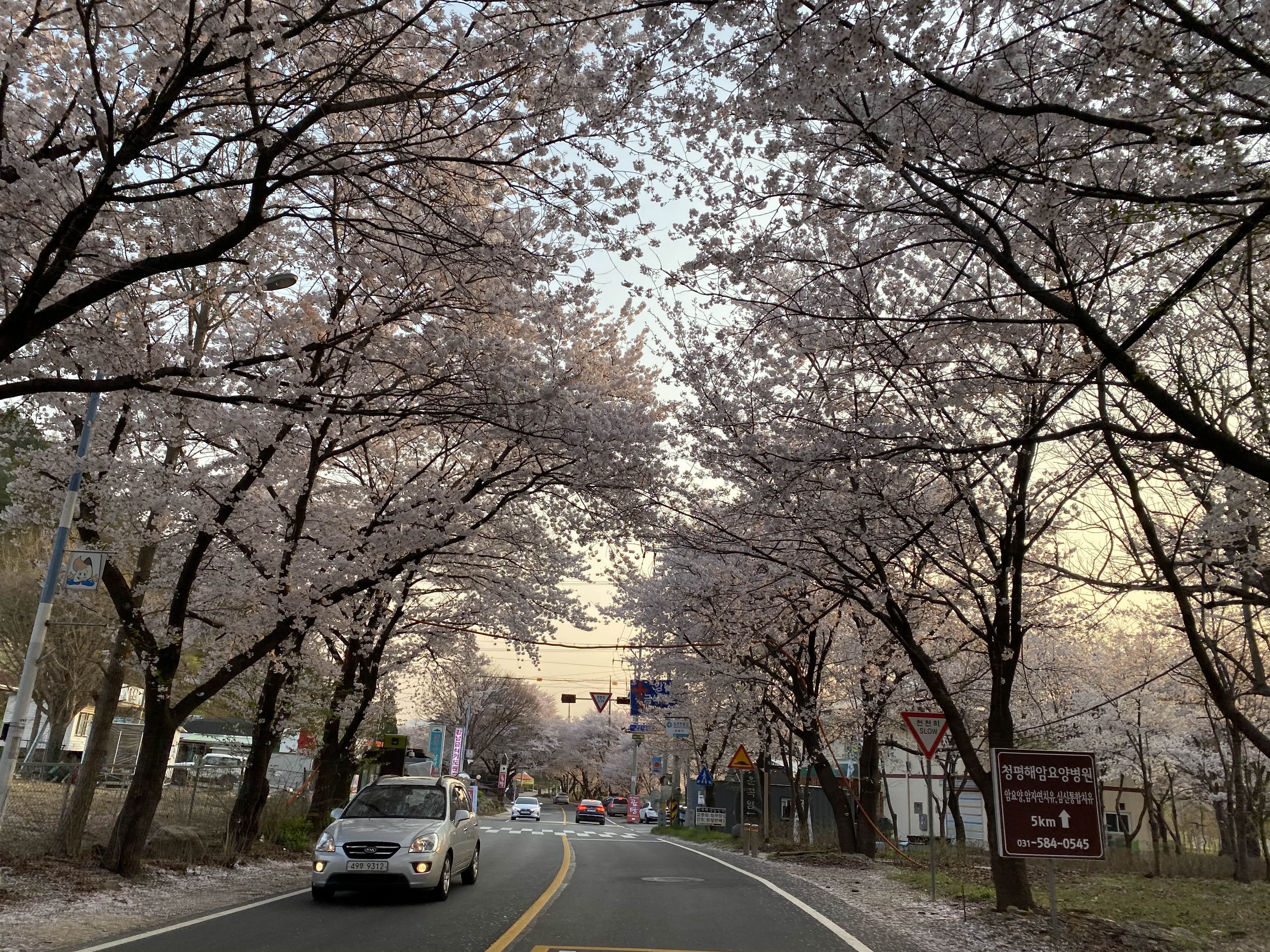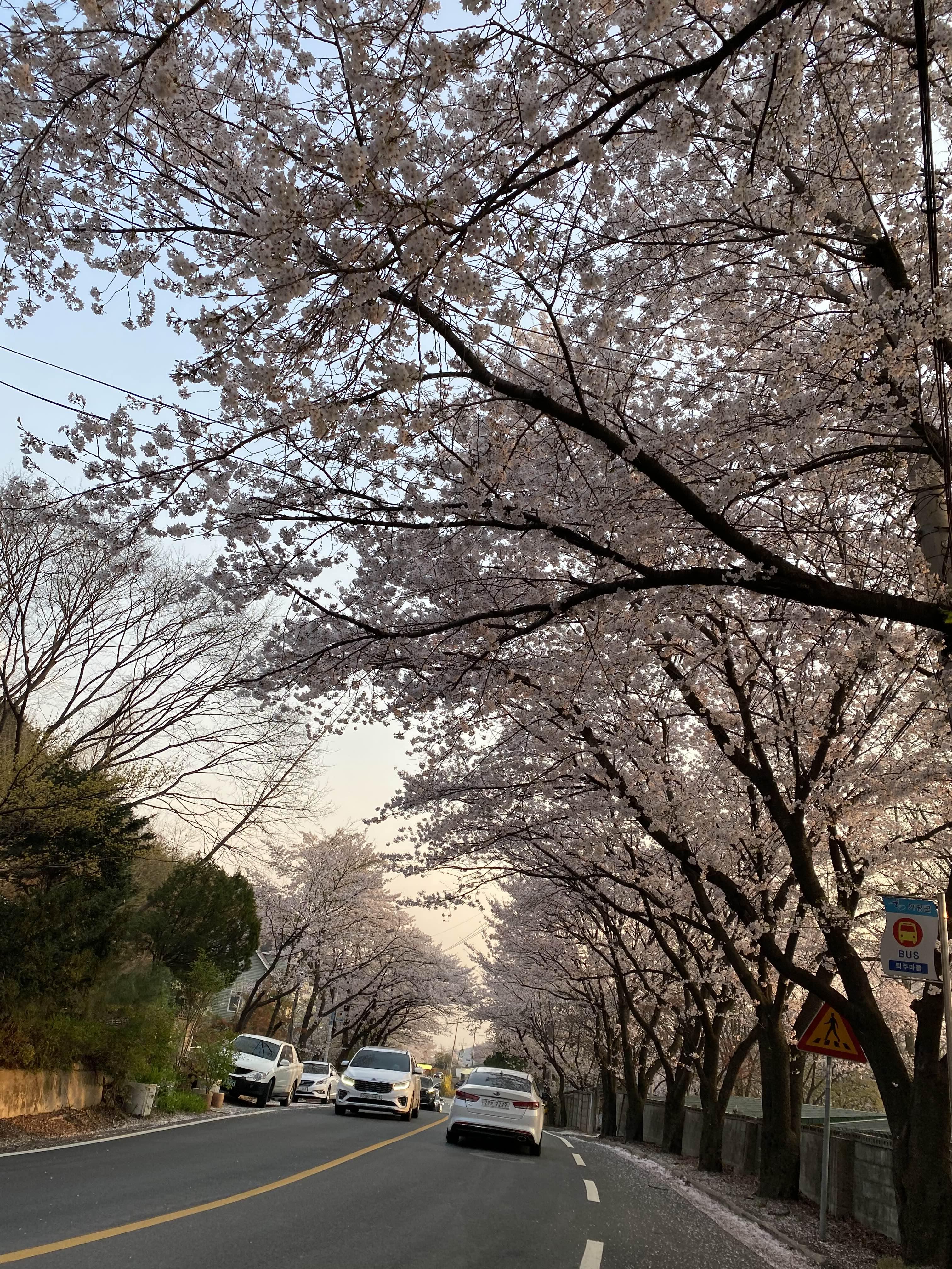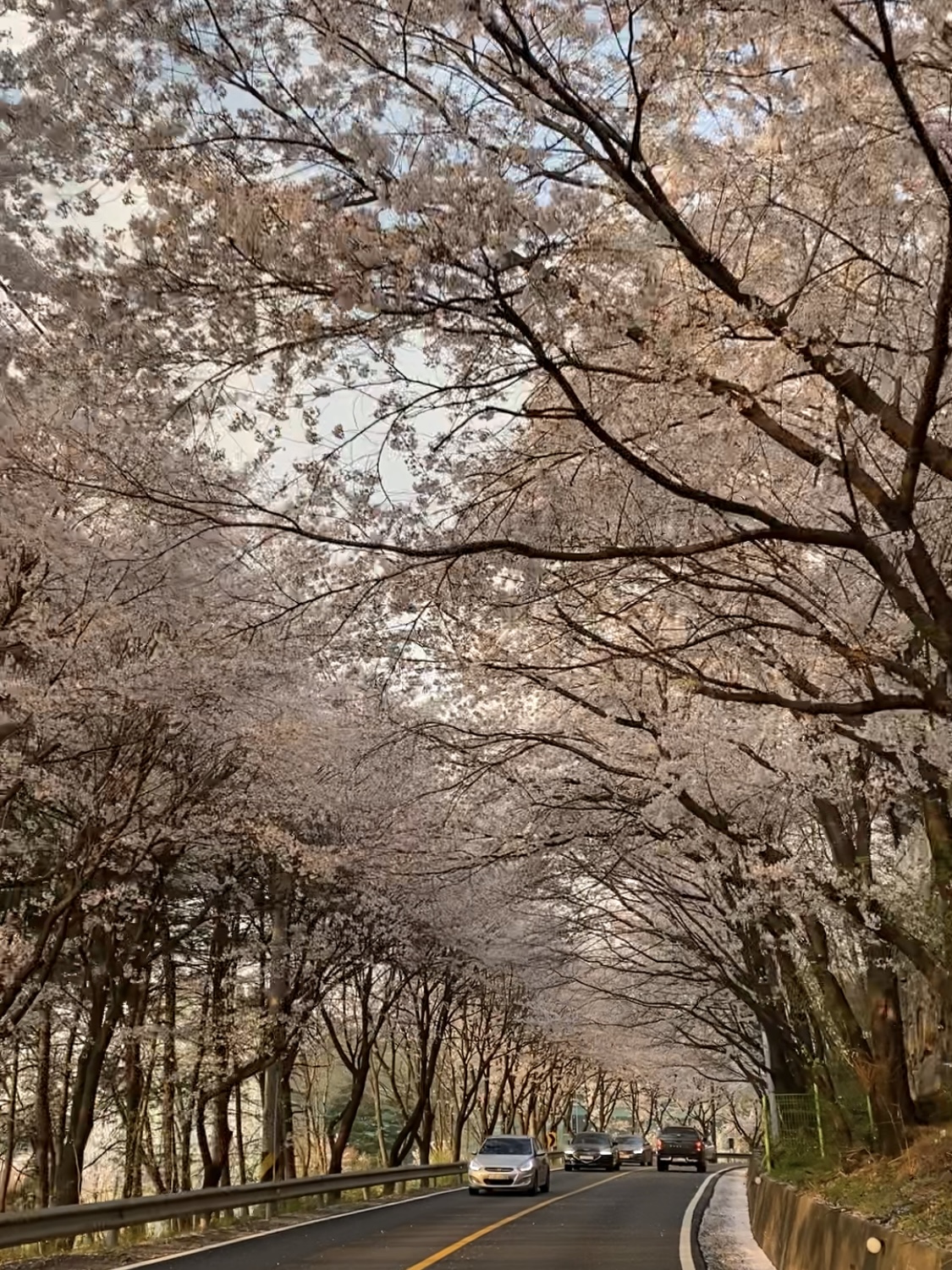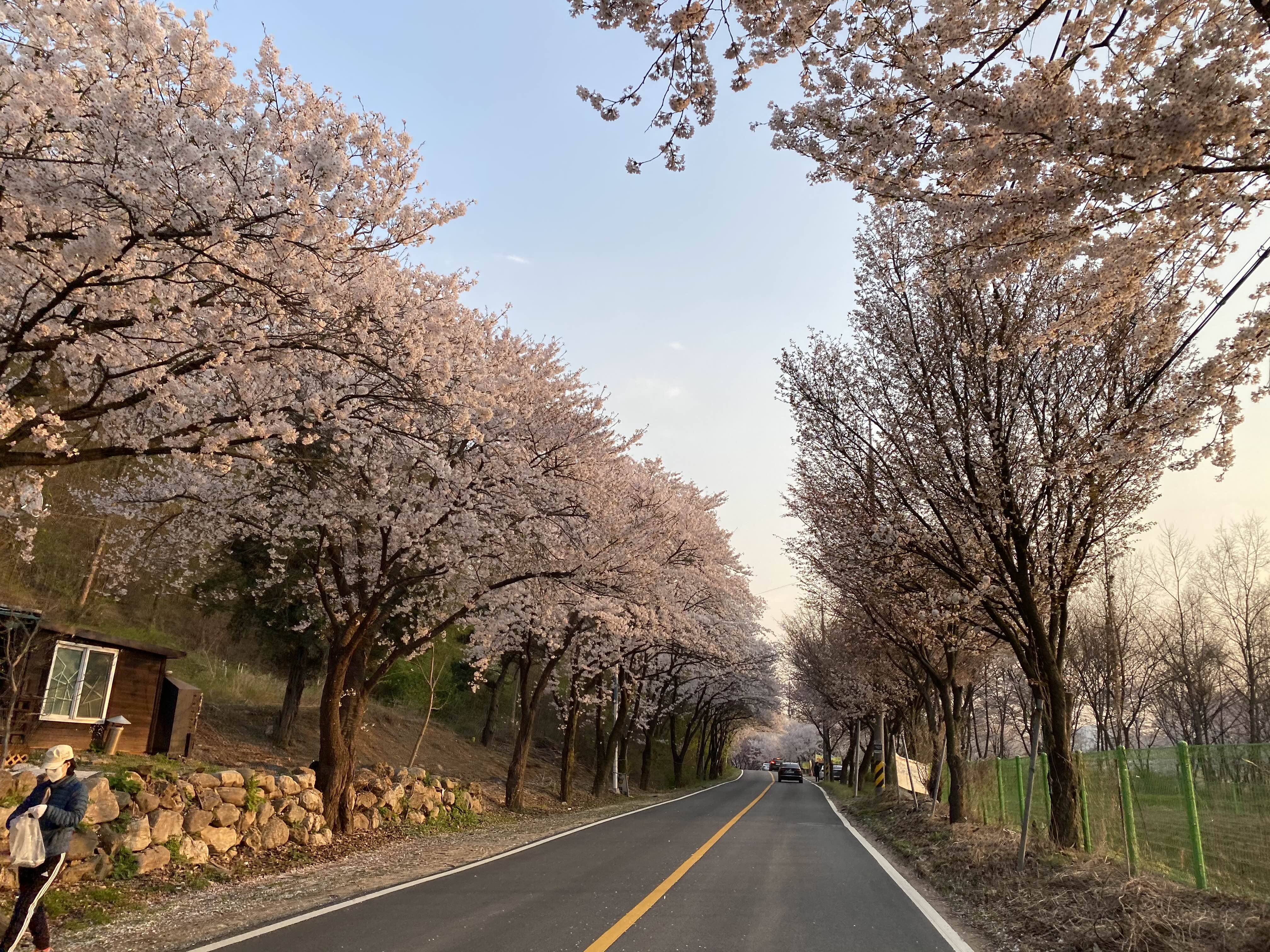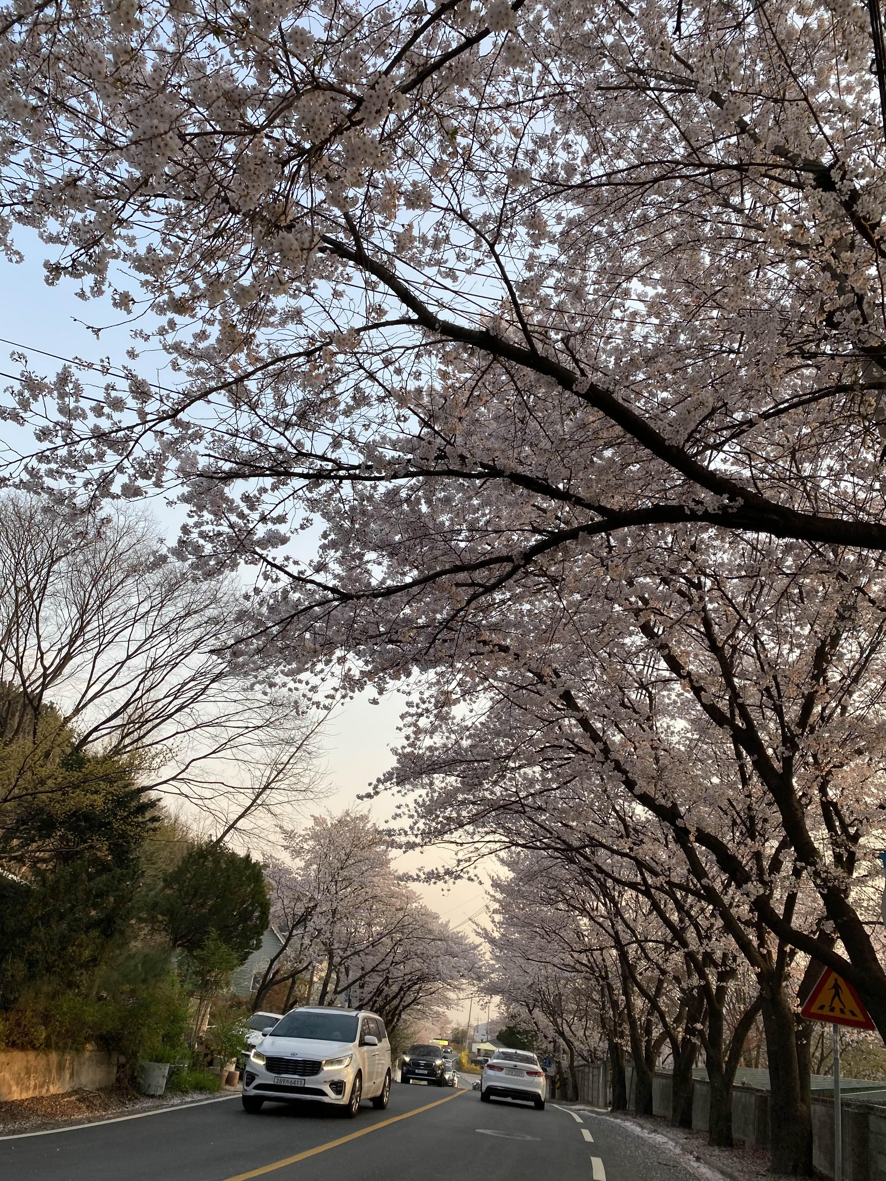 도로 양옆으로 벚꽃나무가 너무 예쁘게 피어있어요