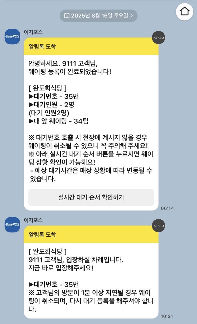 카카오톡으로 실시간 대기 현황을 알려준다.